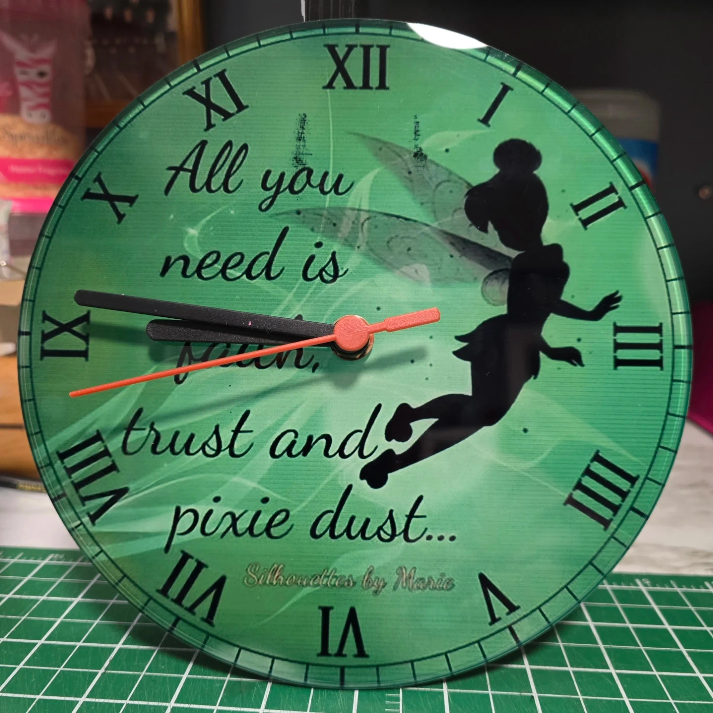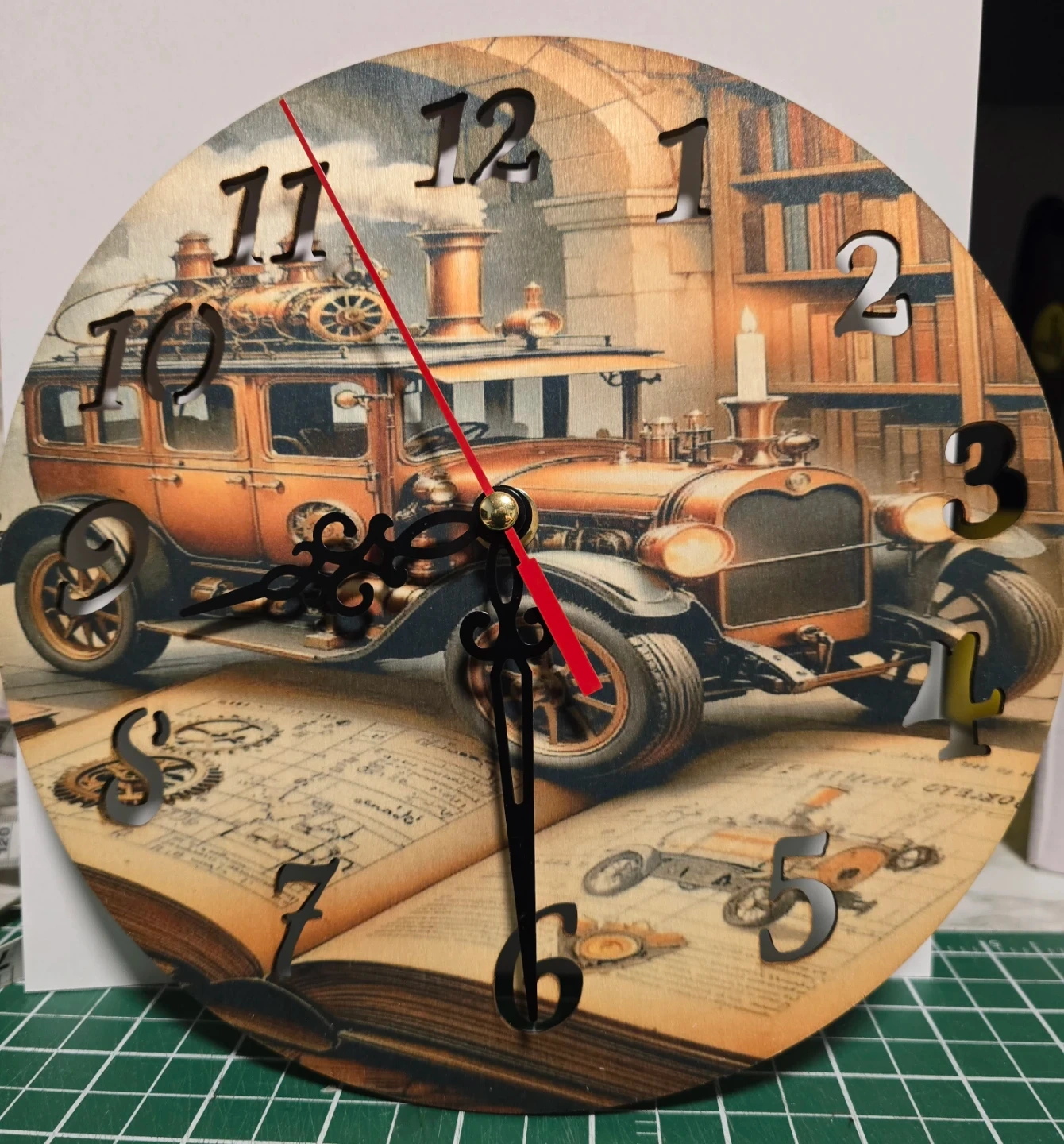 This is a decorative desk clock with various designs available. It measures 8 inches in diameter and features Arabic numerals for easy time-telling. Perfect for adding a unique touch to any room!