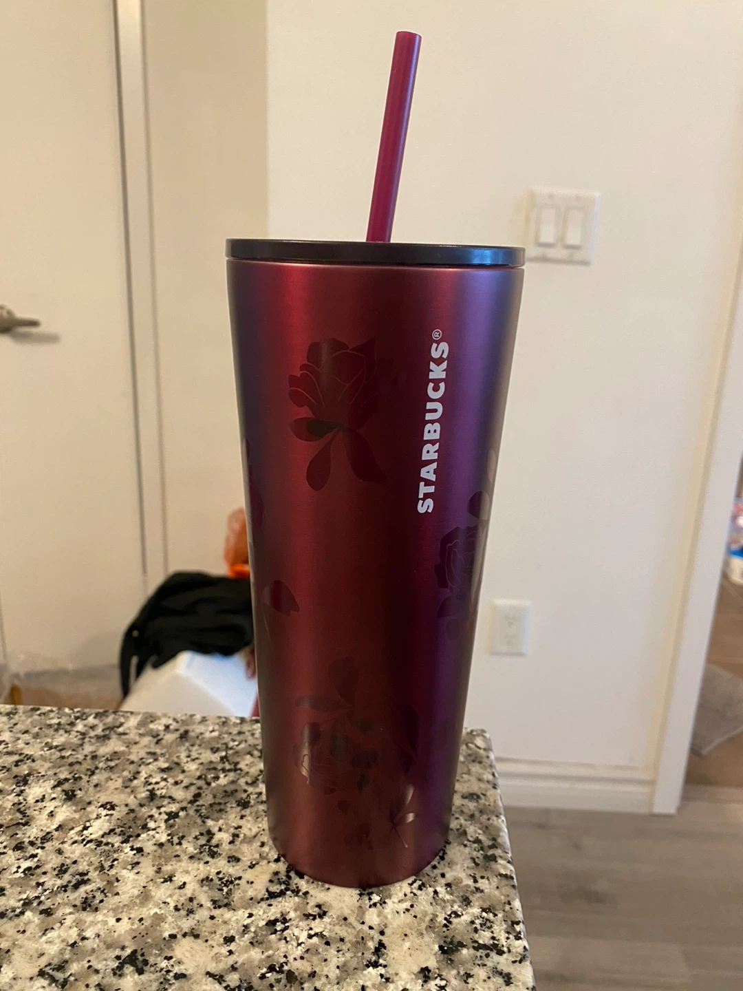 This is a reusable Starbucks tumbler. It has a metallic berry finish with etched floral designs.