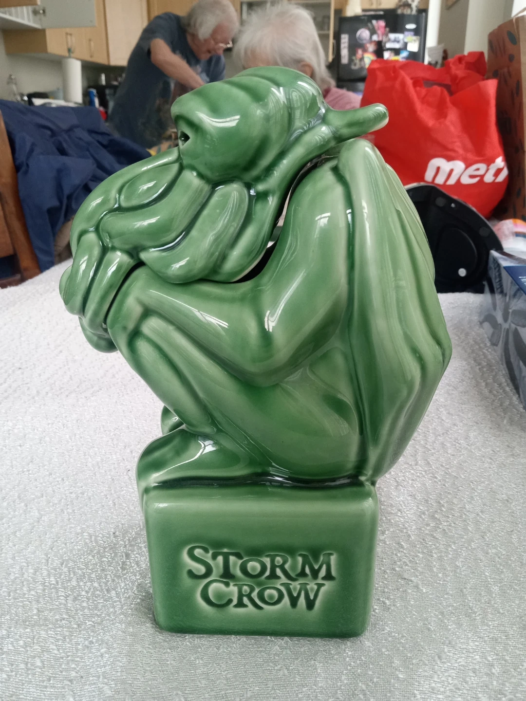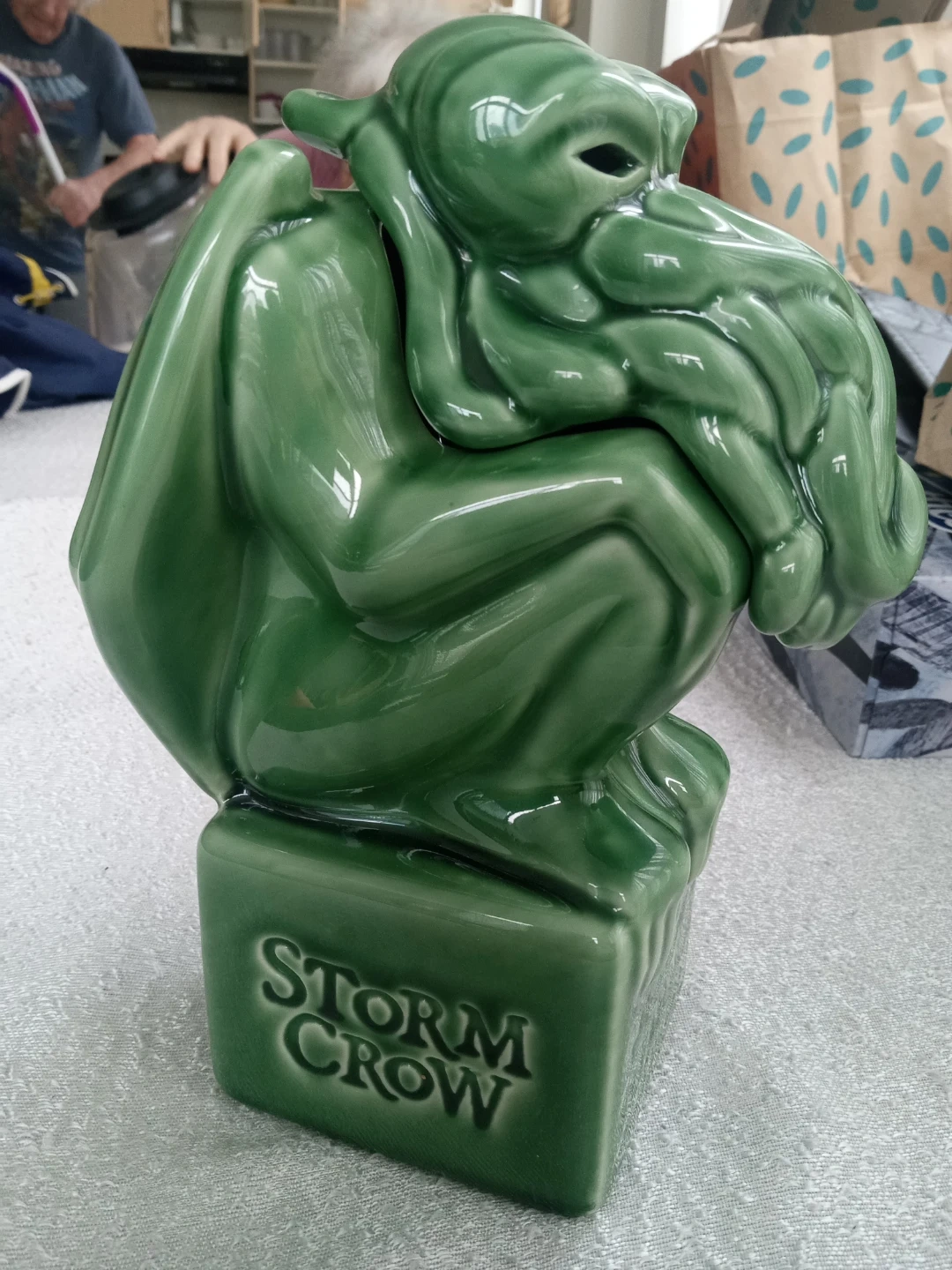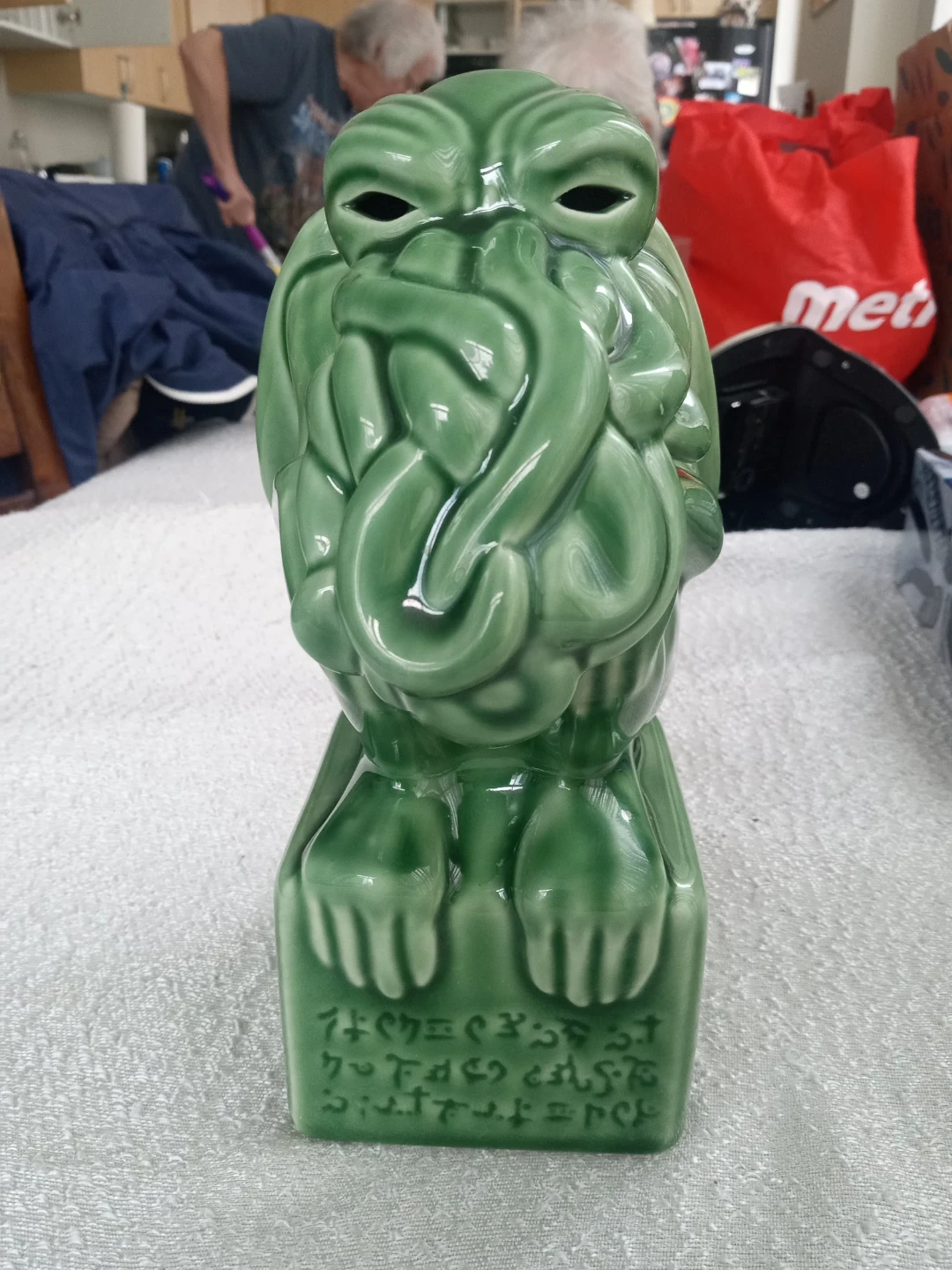 This green ceramic tiki mug features a Cthulhu design with a removable lid. It's from Storm Crow and measures approximately 7 inches tall. Hand wash only; do not machine wash or microwave.