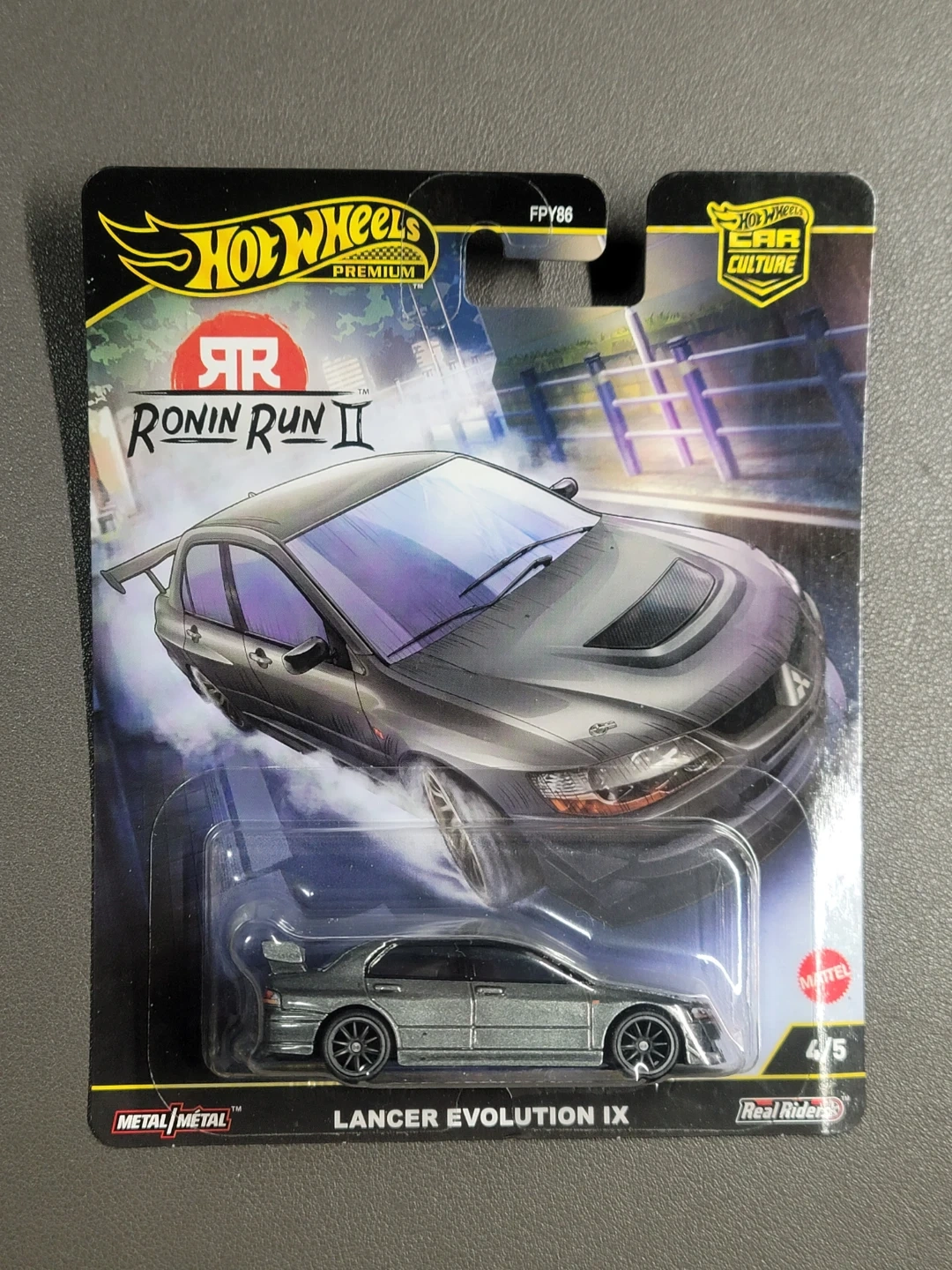 This is a Hot Wheels Premium die-cast model of the Lancer Evolution IX. It's part of the Ronin Run II series and features Real Riders wheels. The model is made of metal.