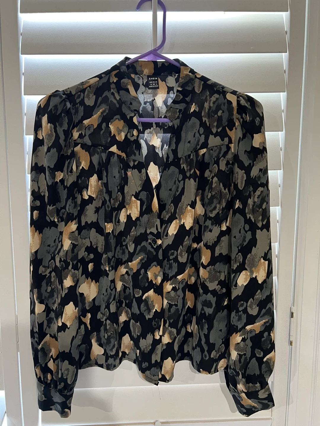 SHEIN button-up blouse with a bold abstract print. It features a collared neckline and long sleeves. This top has a relaxed fit and a flowing silhouette. Its pattern includes black, grey, and beige tones.