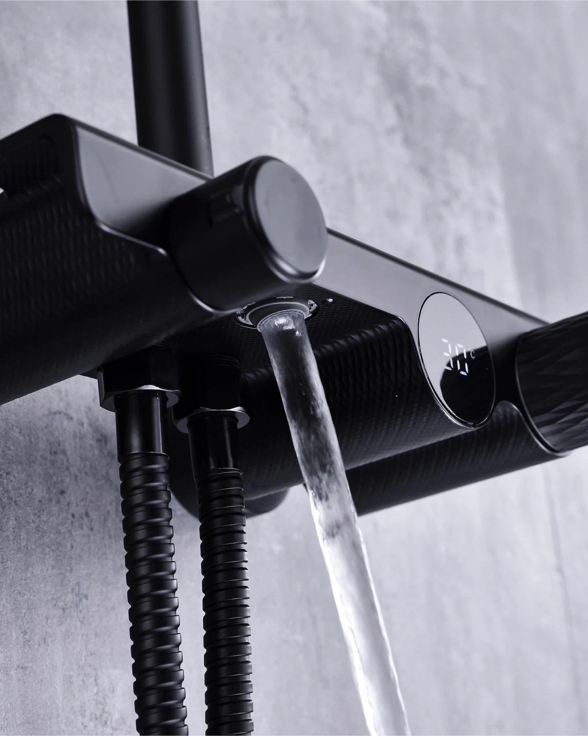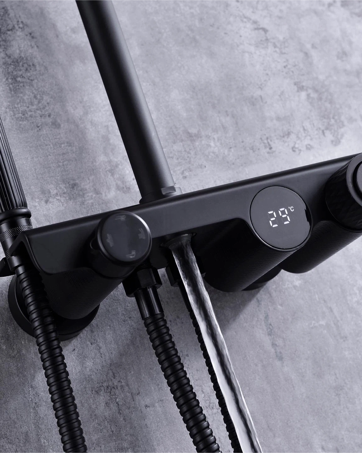 Digital thermostatic shower faucet in black finish. Features a clear temperature display and durable construction. Water temperature displayed in Celsius.