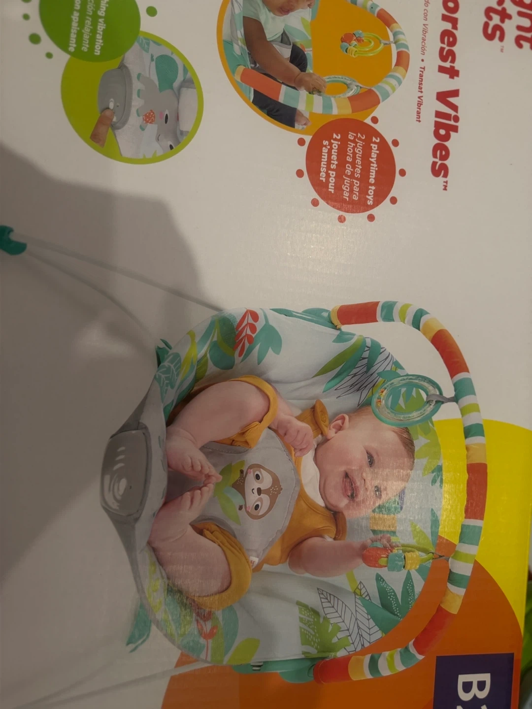 This Bright Starts bouncer seat is designed for "Rainforest Vibes" theme. It features soothing vibration to calm baby. The supportive seat design provides extra comfort. It includes 2 playtime toys for entertainment.