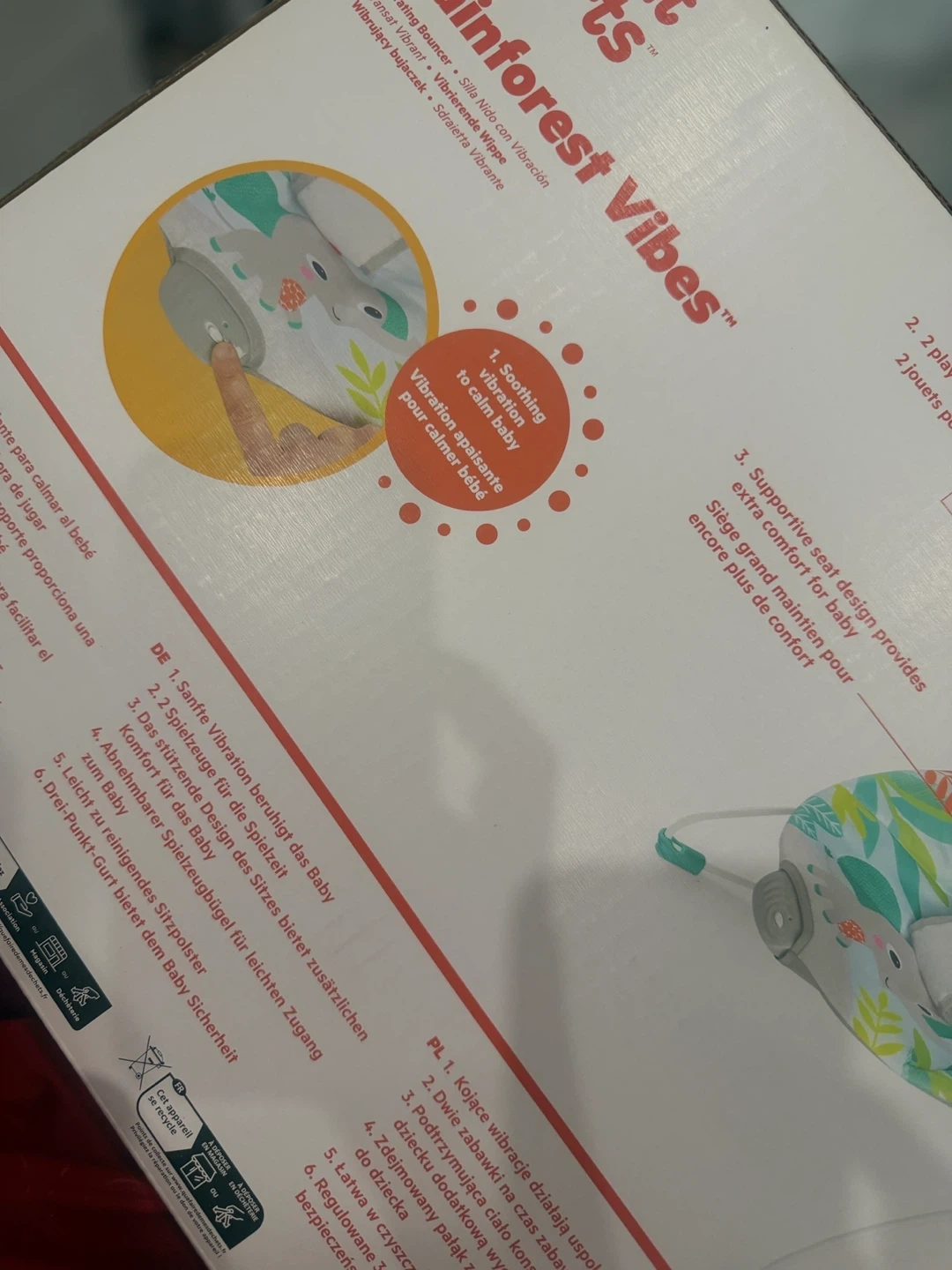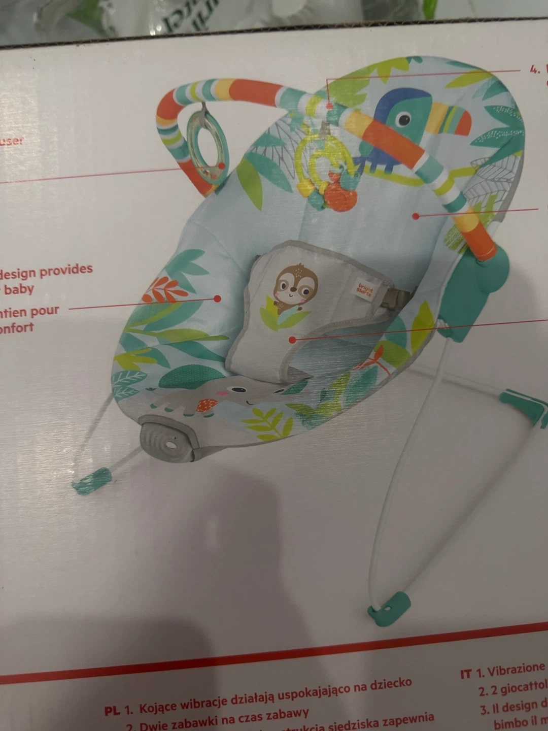 This Bright Starts bouncer seat is designed for "Rainforest Vibes" theme. It features soothing vibration to calm baby. The supportive seat design provides extra comfort. It includes 2 playtime toys for entertainment.