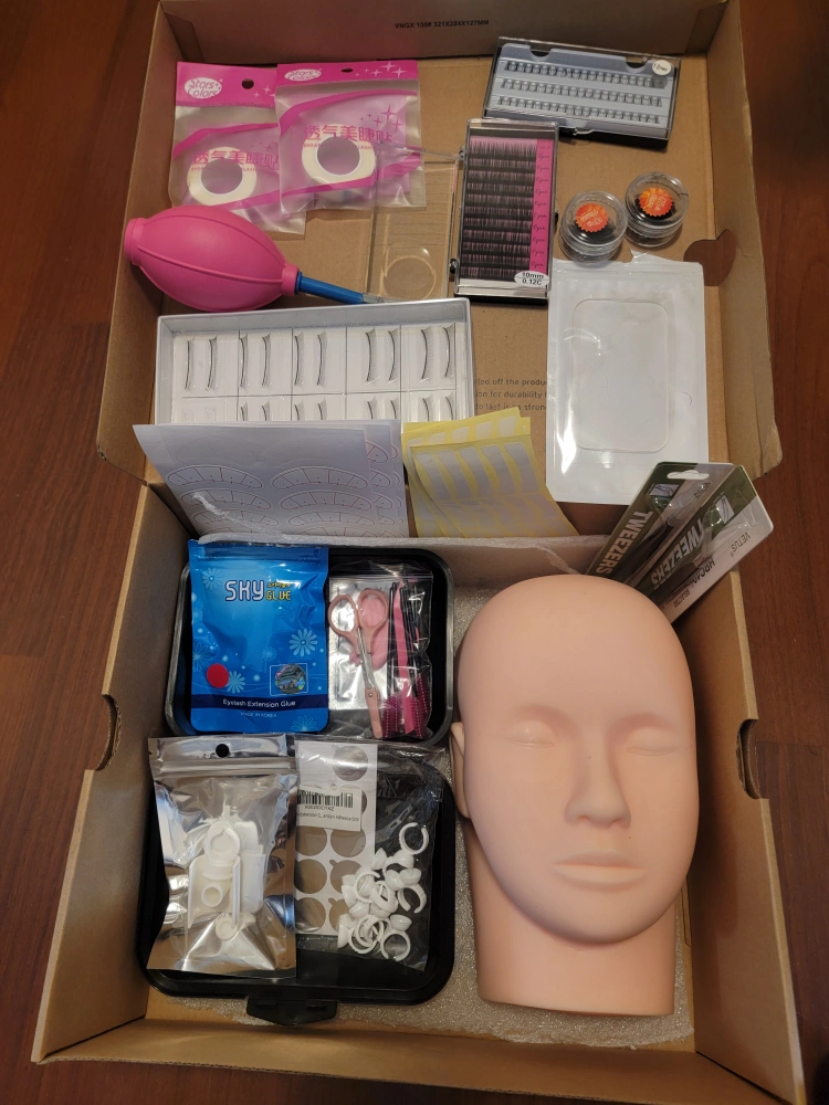 Complete eyelash extension kit. Includes practice head, various lashes, glue, tweezers, and other tools. Great for beginners or experienced lash artists.