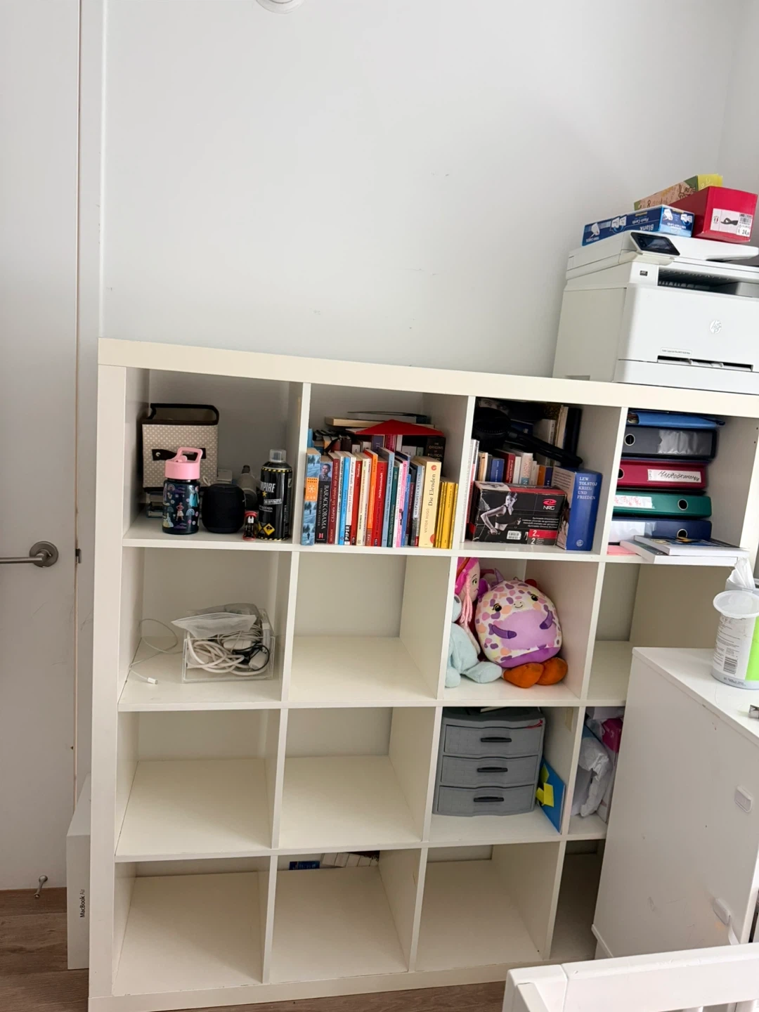 This is a white cube shelf unit with 16 cubbies from Ikea (Kallax). It's perfect for storing books, decor, or other household items.