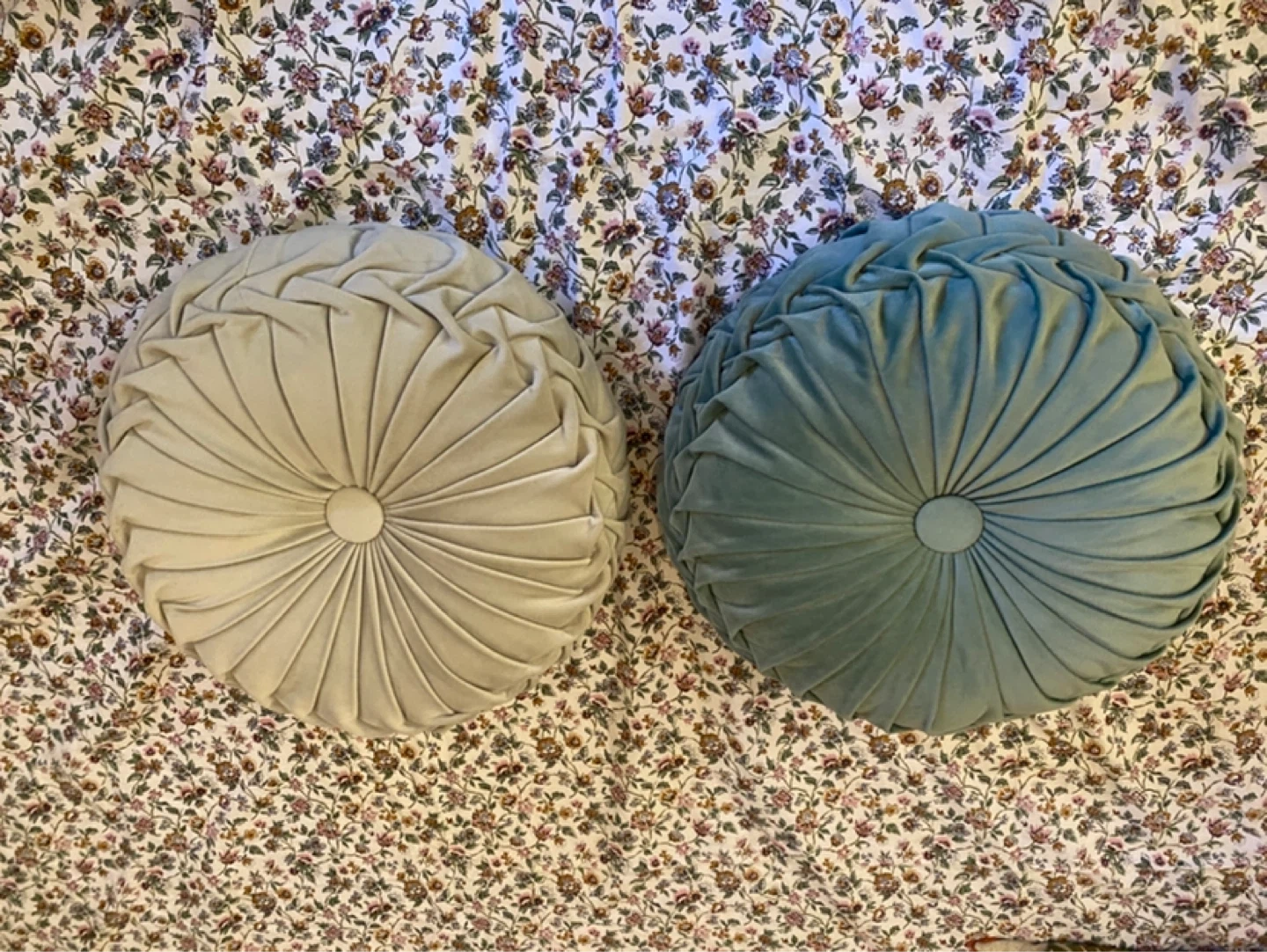 Set of 2 Pleated Round Throw Pillows - light grey & teal