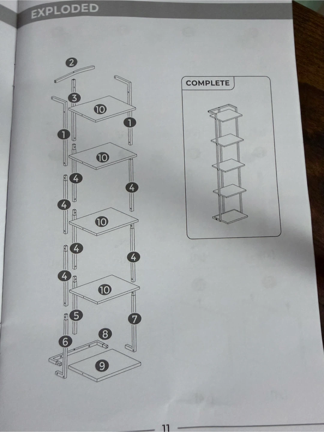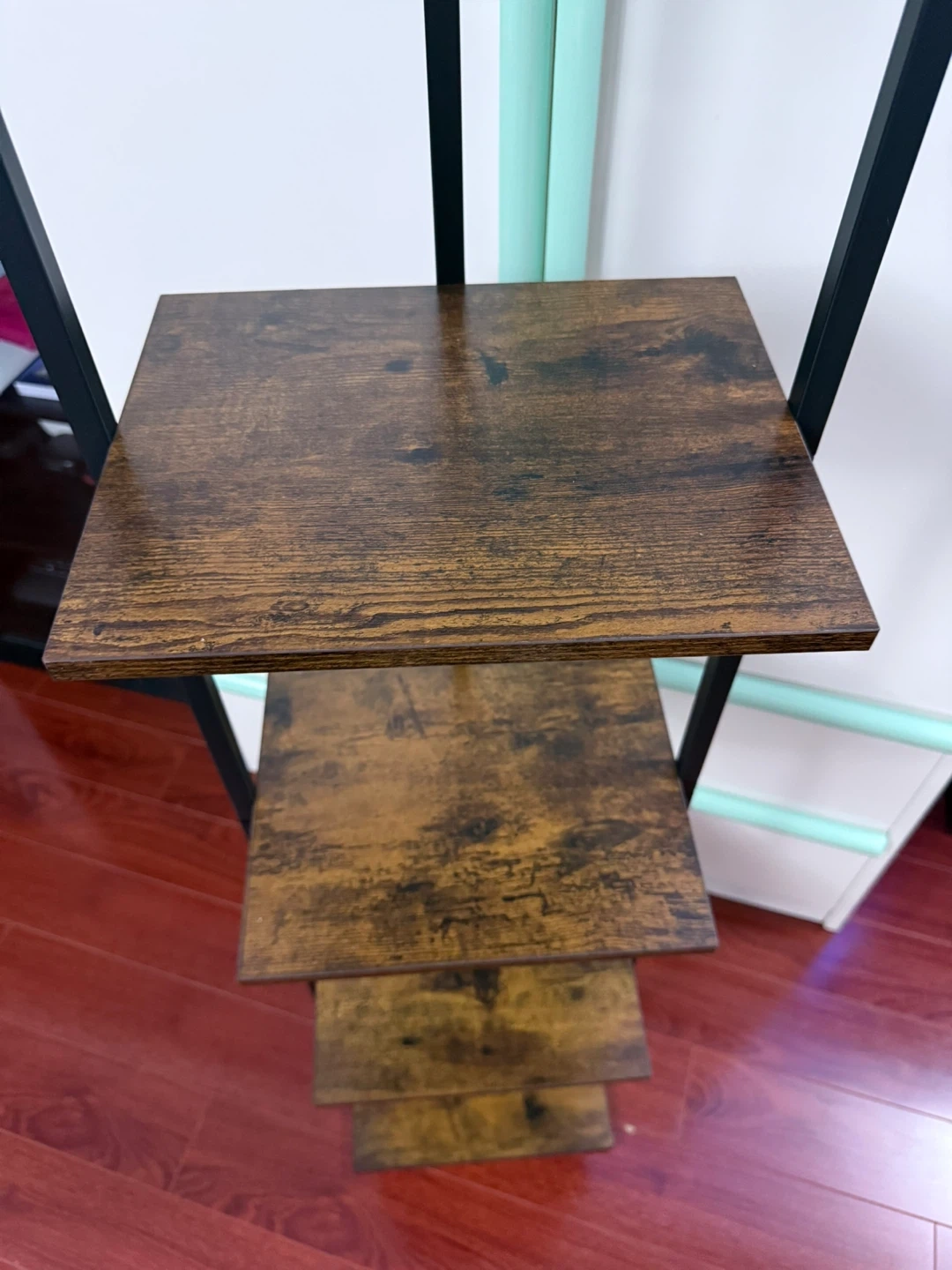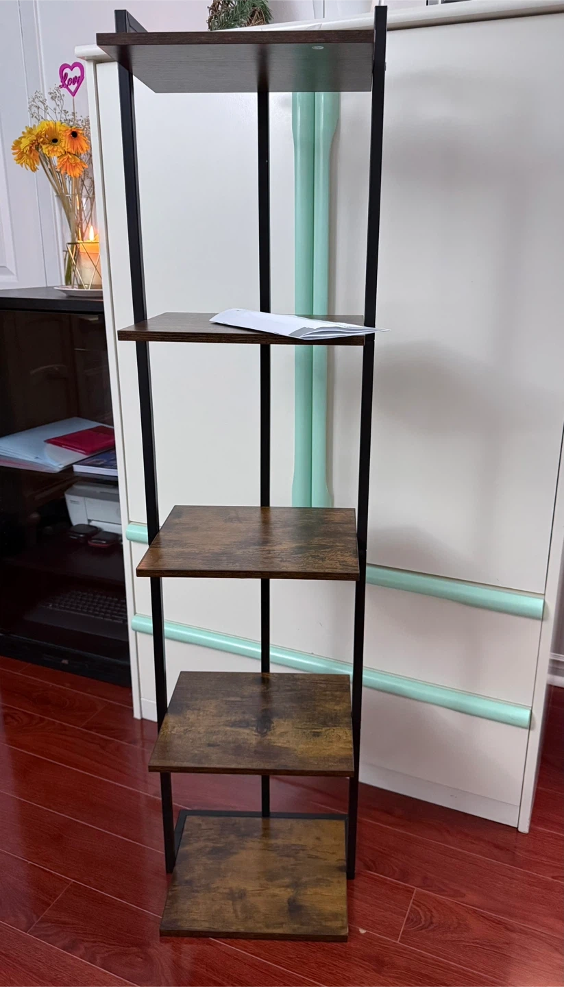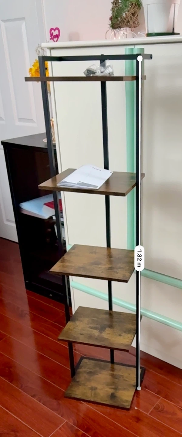 This bookshelf has a rustic wood grain finish with a black metal frame. It's 1.52m tall with 5 shelves, each shelf being 29cm deep. It's perfect for displaying books or decor!
