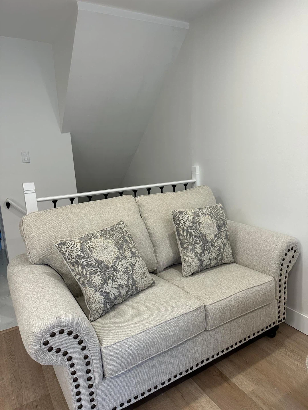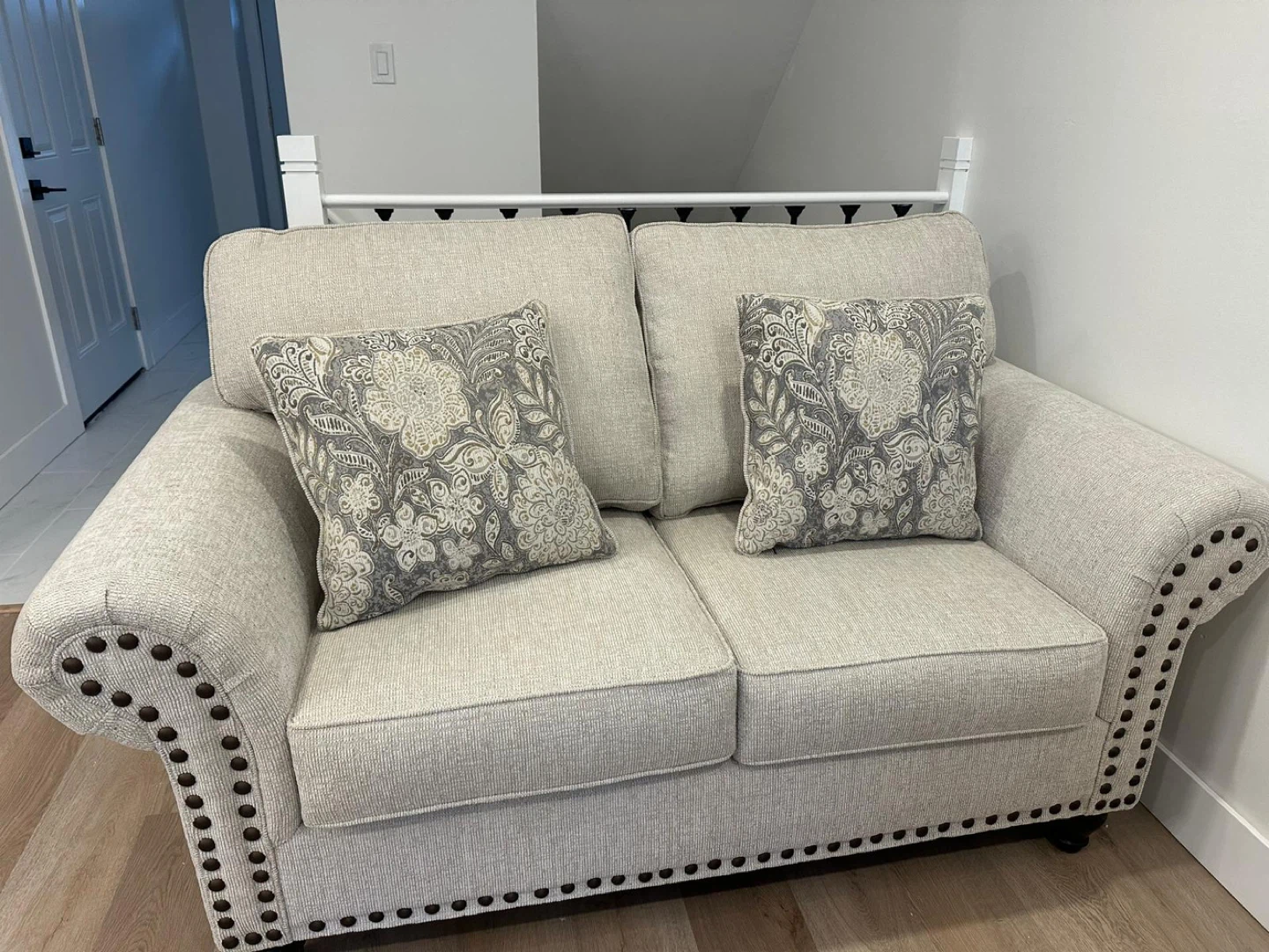 This is a beige upholstered loveseat with two decorative throw pillows. It features rolled arms and decorative nailhead trim. It's a great accent piece for a living room or bedroom.