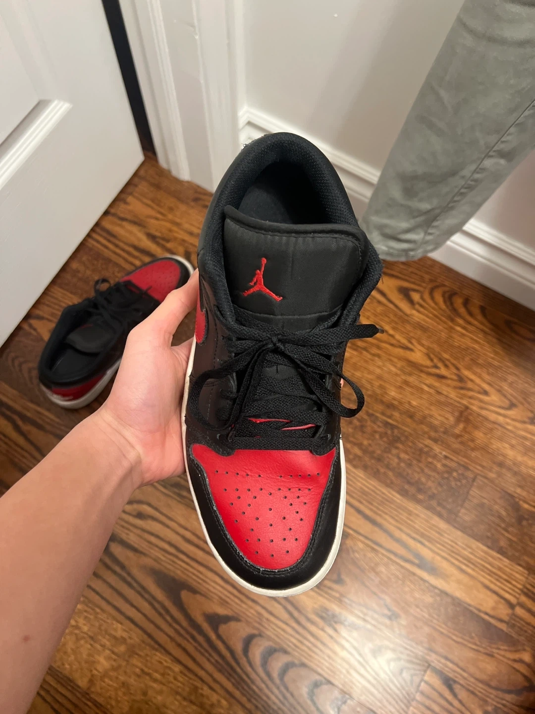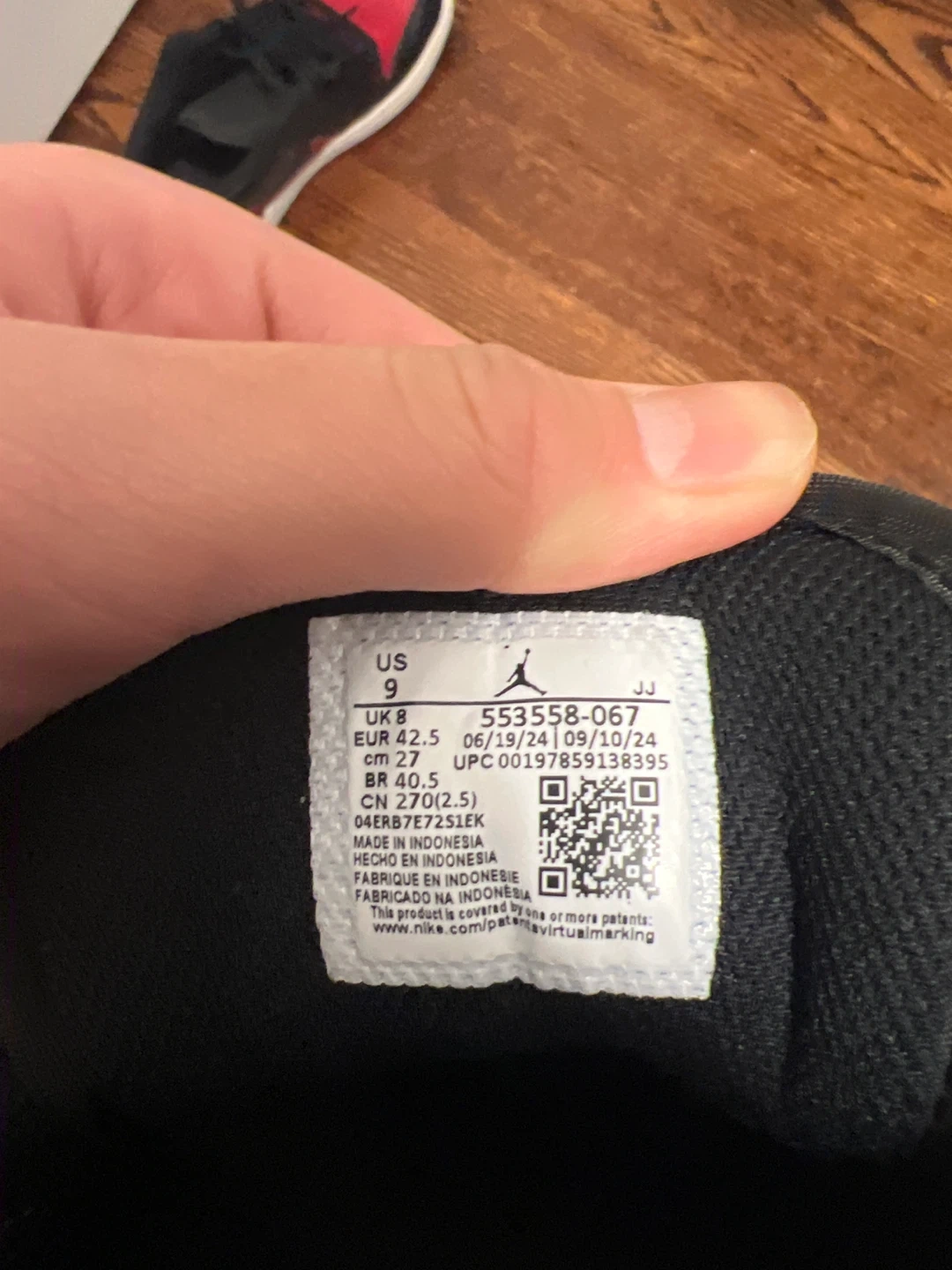 These are Air Jordan 1 Low Reverse Bred sneakers in black and red. Size US 9, EUR 42.5, BR 40.5. Made in Indonesia.