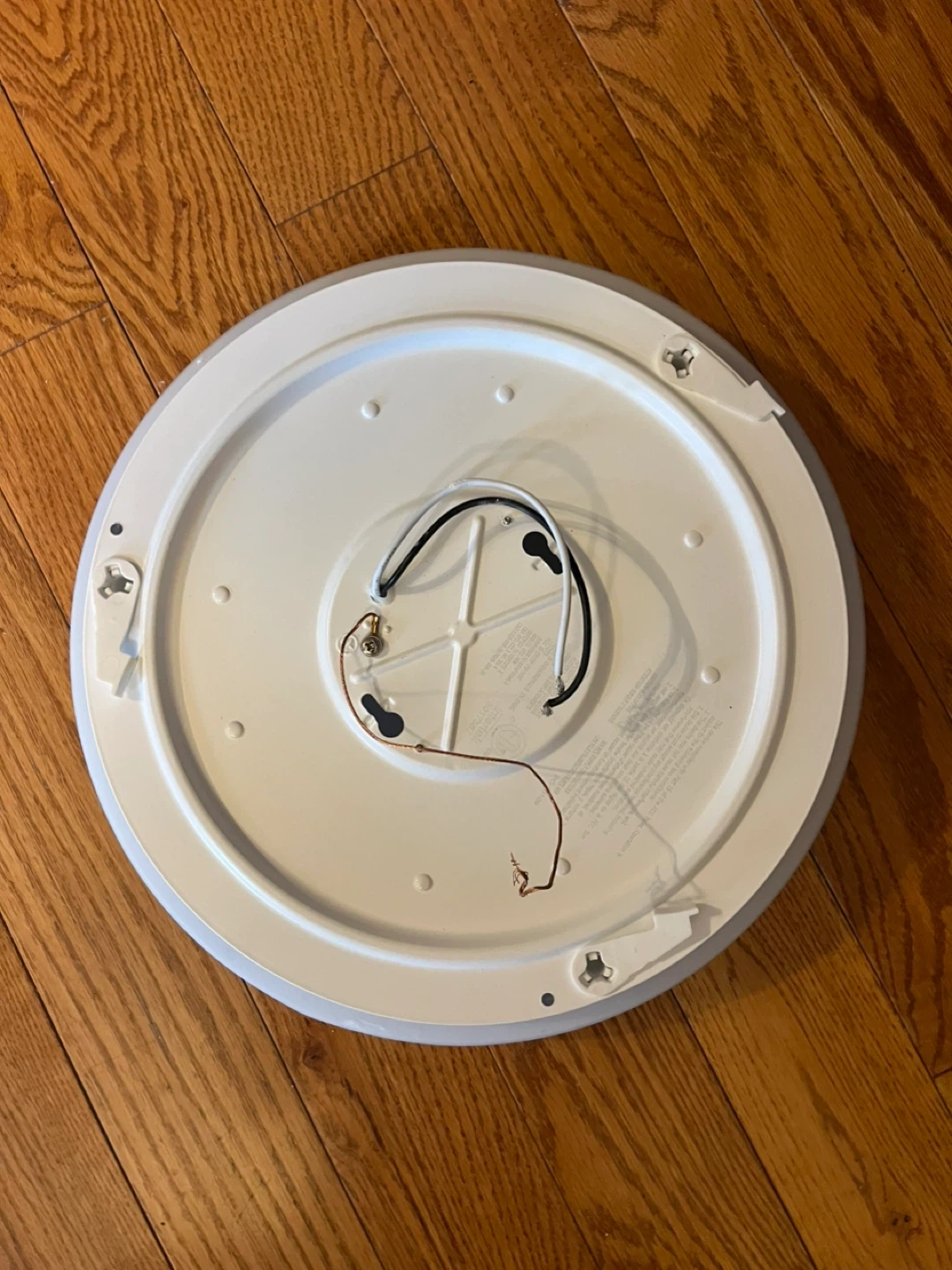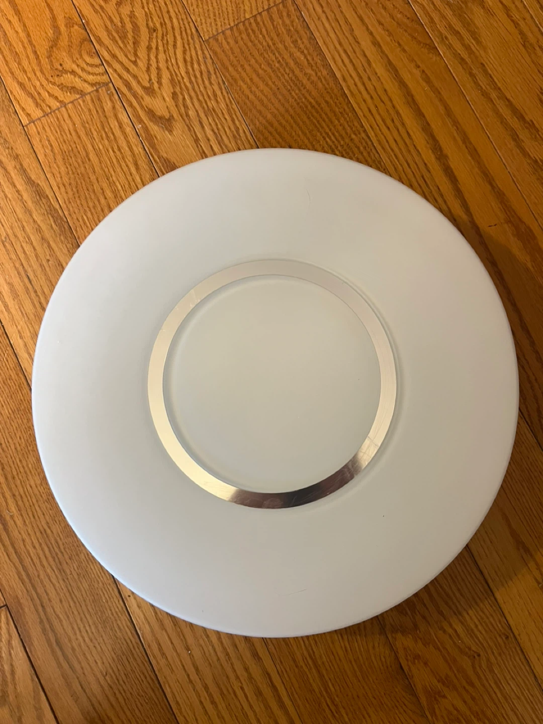 This is a white ceiling light fixture. It has a silver accent ring around the edge. The fixture is round and made of plastic and metal.
