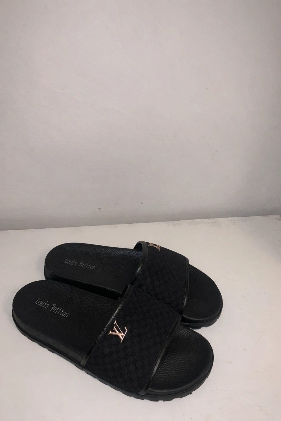 Black Louis Vuitton slides. Classic monogram pattern on the strap. Comfortable and stylish for everyday wear.
