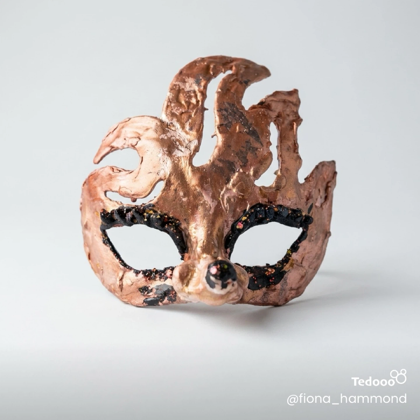This unique fox mask is handcrafted with a rustic, earthy design. It features textured details and decorative trim around the eyes. This piece would make a striking decorative item or a costume accessory!
