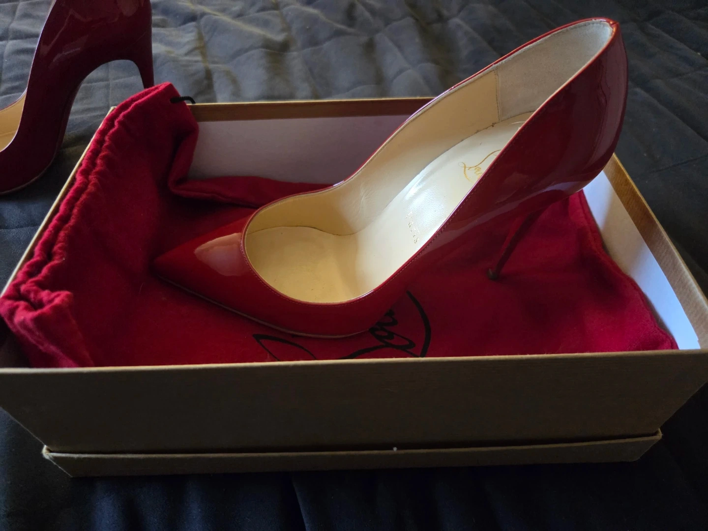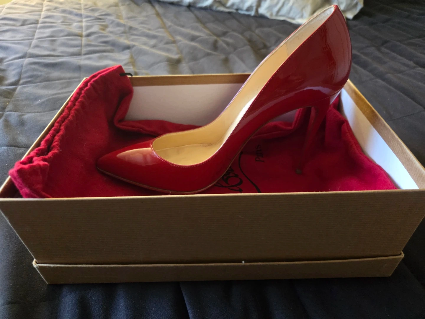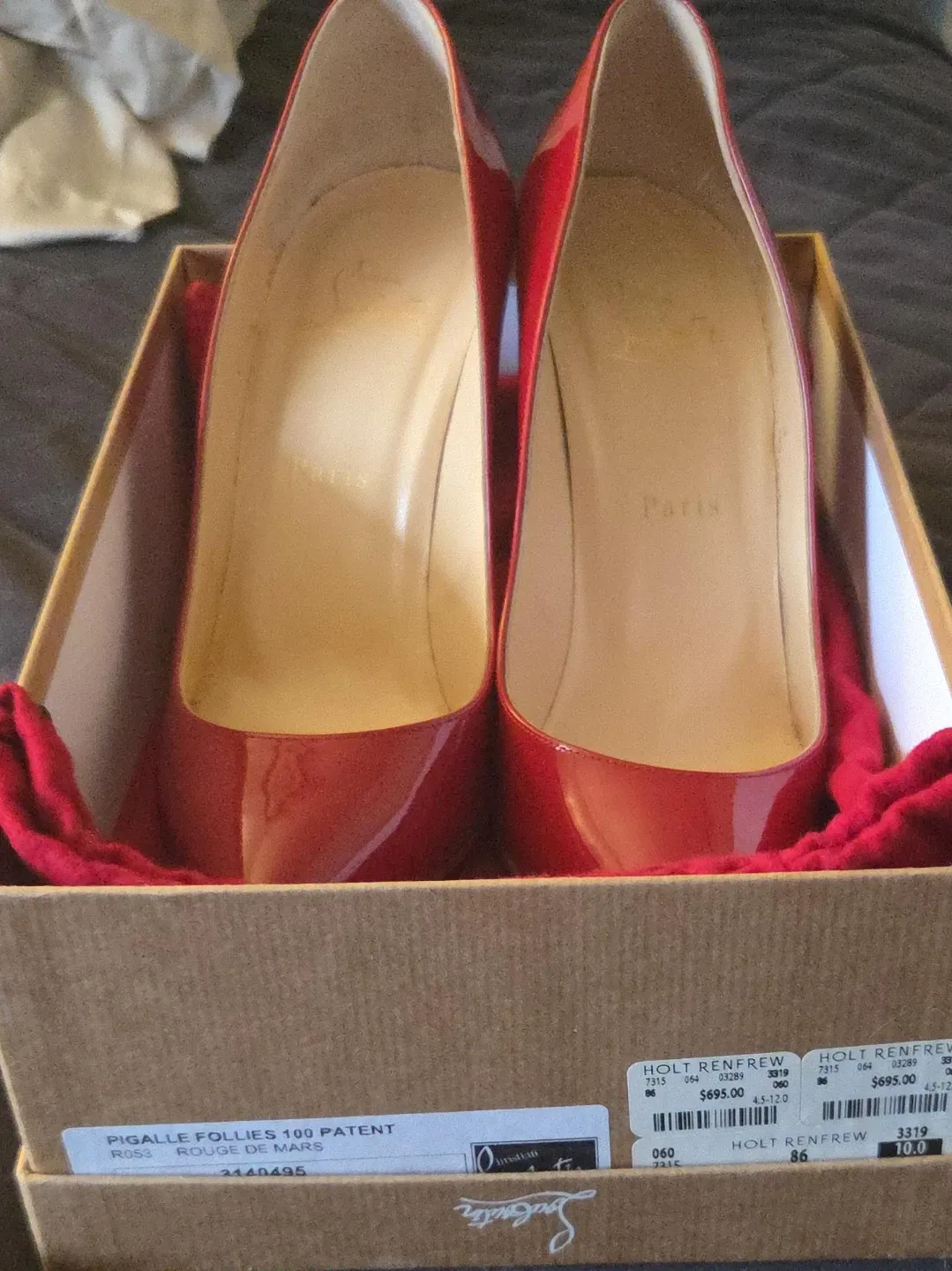 Classic red patent leather heels from Christian Louboutin. These Pigalle Follies are a size 36 and feature a 100mm heel height. They come with the original box and dust bag. (There is a small Crack in the heel of the left heel, But there is no need to worry it is very much stable)