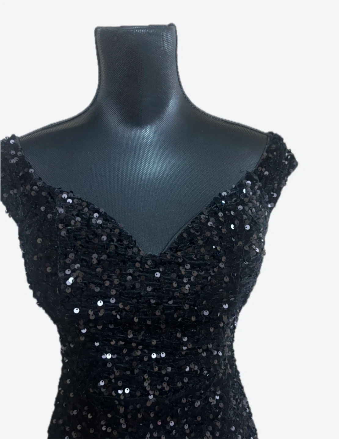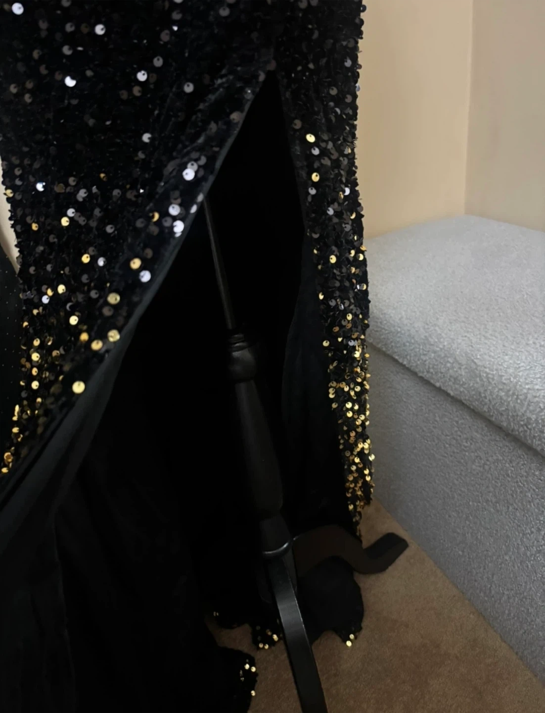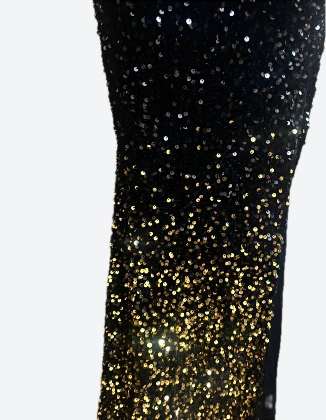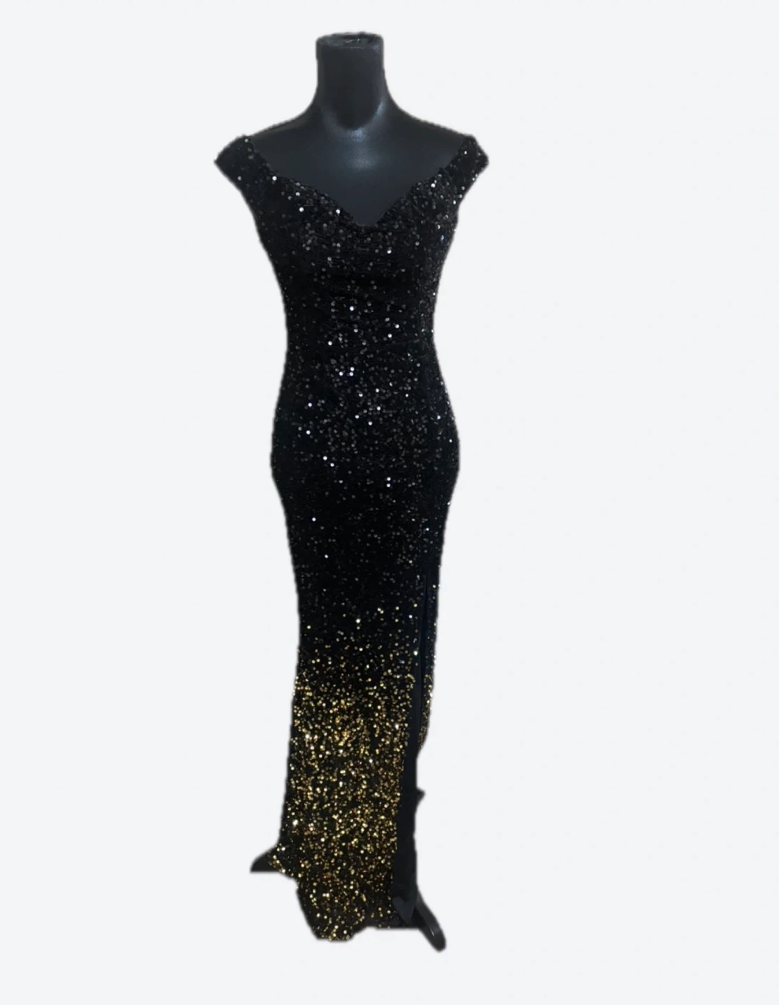Gorgeous black evening gown with gold sequin detailing! Perfect for a special occasion or a night out. The sequins add a touch of sparkle and glamour, making it a real head-turner. It's in great condition and ready for a new home!