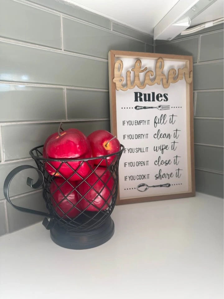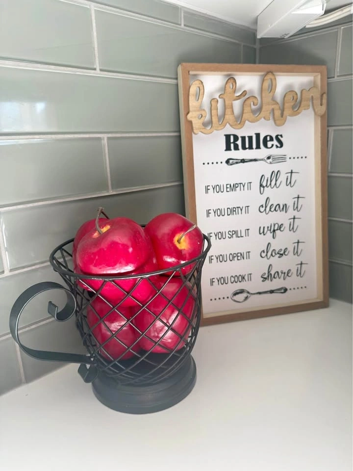 Add a touch of farmhouse charm to your countertop with this stylish kitchen set. Perfect for keeping your workspace organized while maintaining a clean, aesthetic vibe. Matte Black Wire Basket: Features a unique "teacup" silhouette with a decorative scroll handle. Itβs sturdy, breathable (perfect for keeping fruit fresh), and holds approximately 5-7 large apples or citrus fruits. "Kitchen Rules" Wood Framed Sign: A playful and rustic wooden sign featuring 3D "Kitchen" lettering and classic household reminders. Free-standing design makes it easy to tuck into corners or under cabinets.
