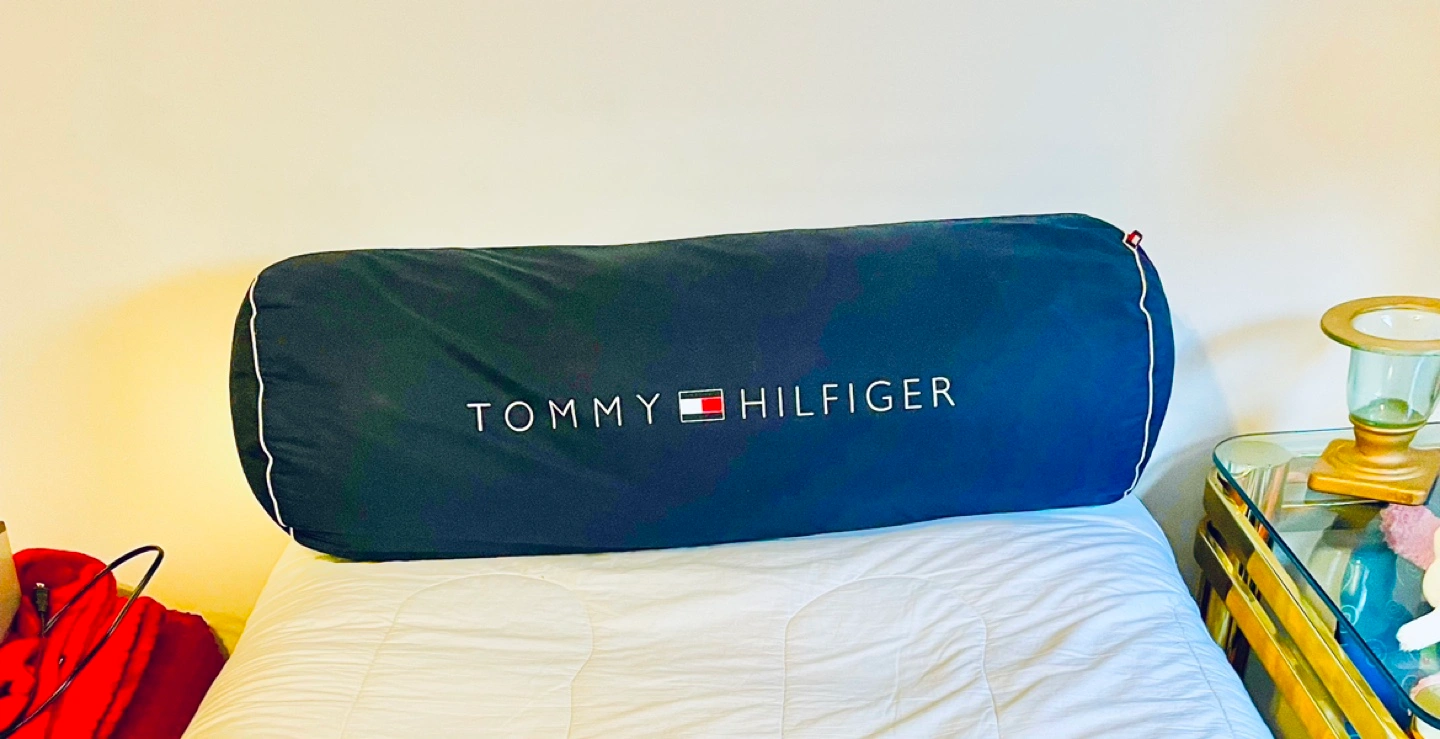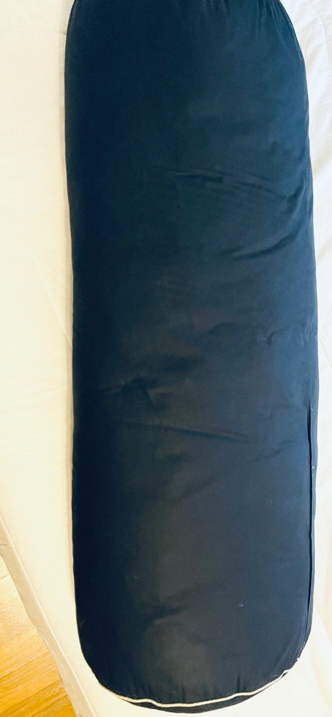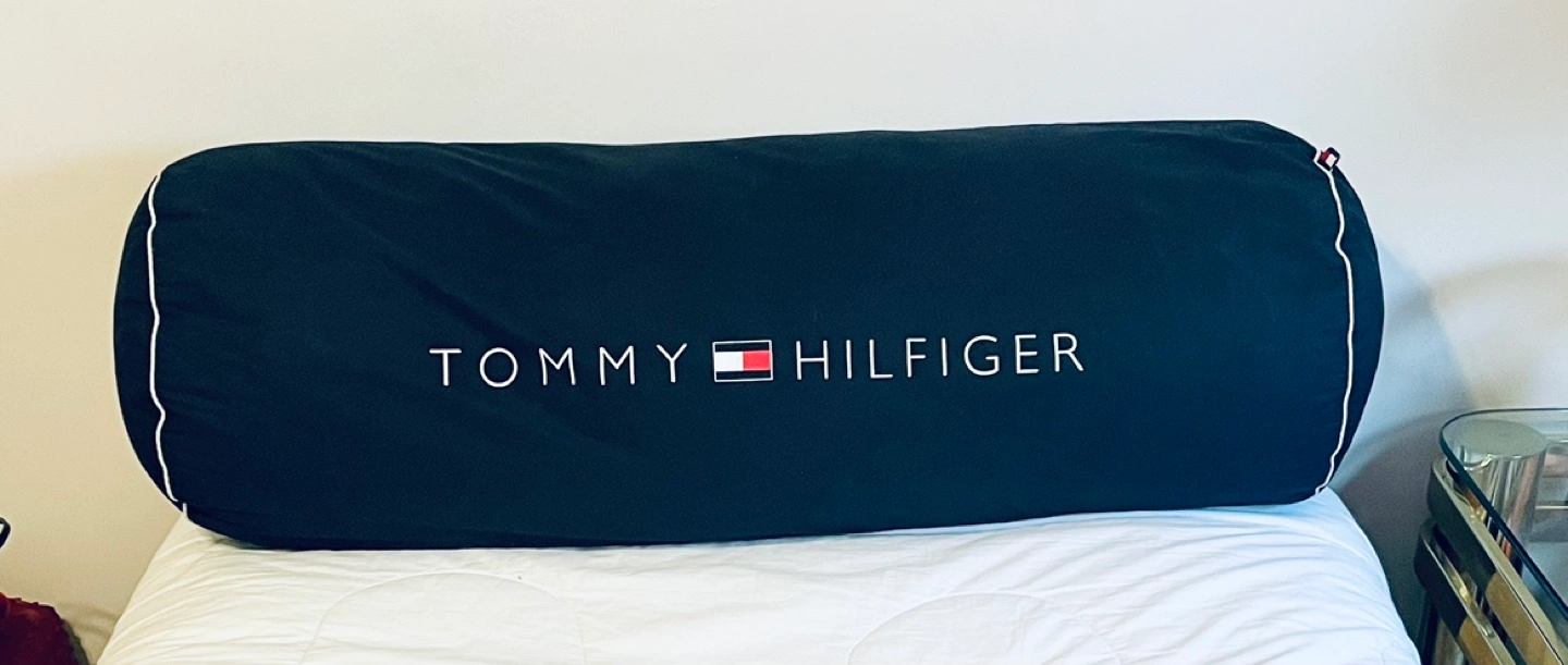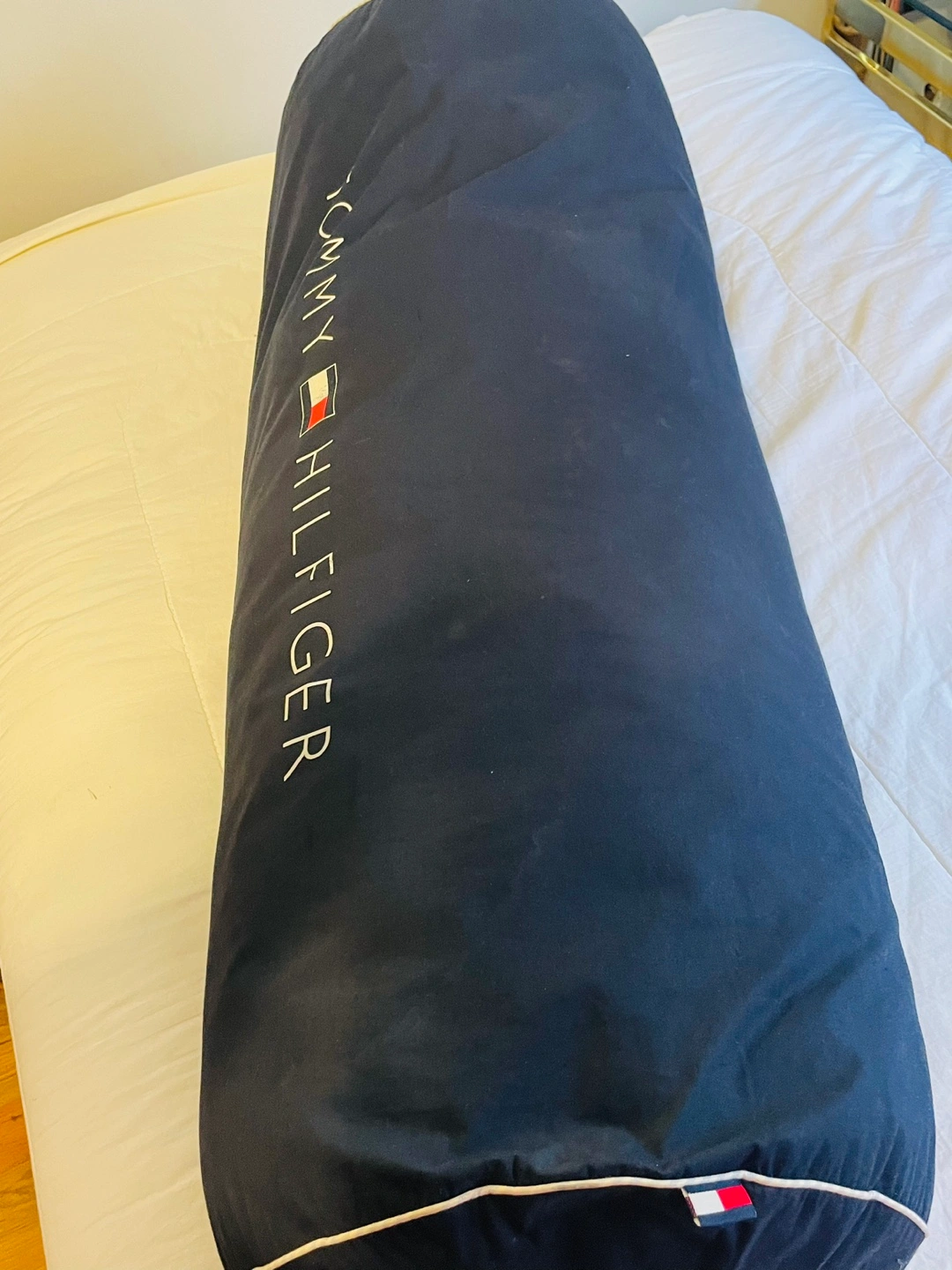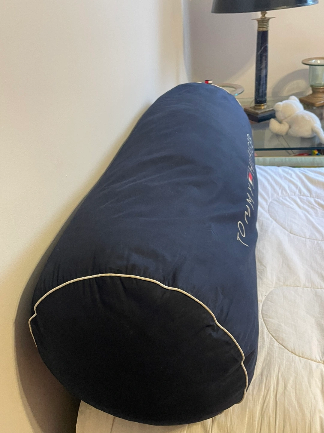 Navy blue bolster/ body pillow. Tommy Hilfiger embroidered on the side. Off-white piping detail.