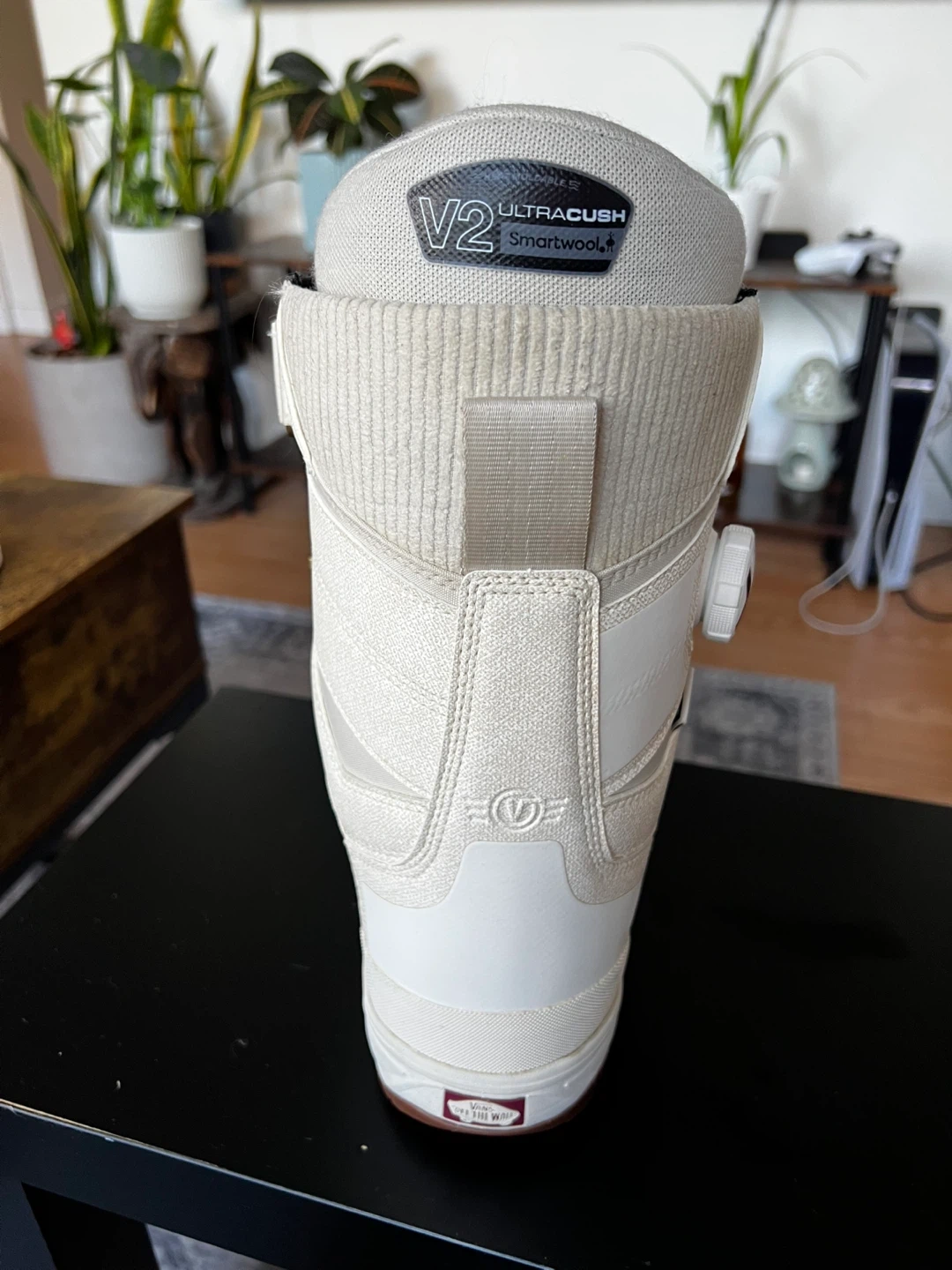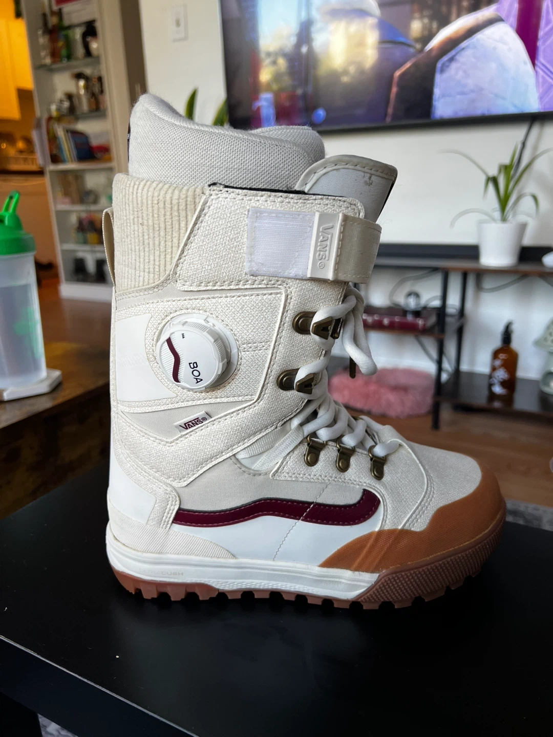 Vans snowboard boots with Boa closure system. Features Ultracush Smartwool lining. Cream and maroon colourway.