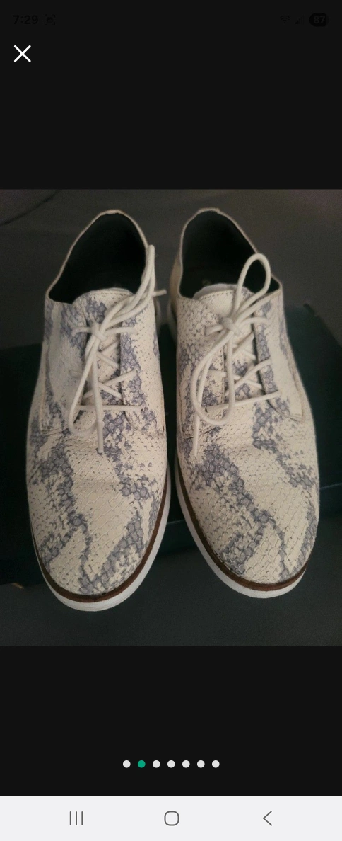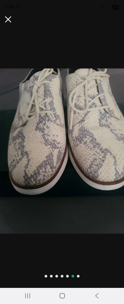 These shoes are white and gray with a textured pattern. They are lace-up. The soles are white and have a thin brown trim. You'll surely enjoy wearing these out for a walk.