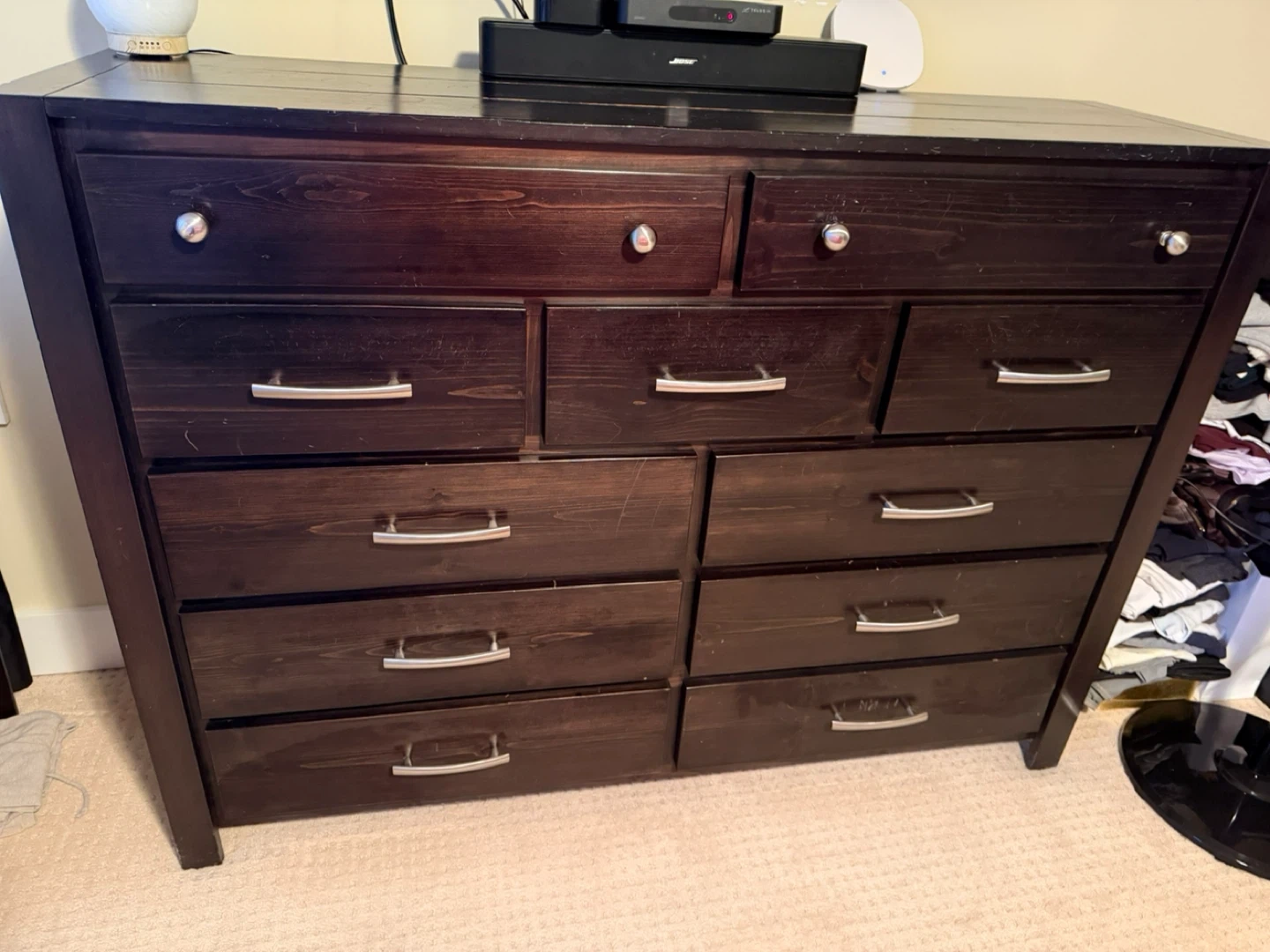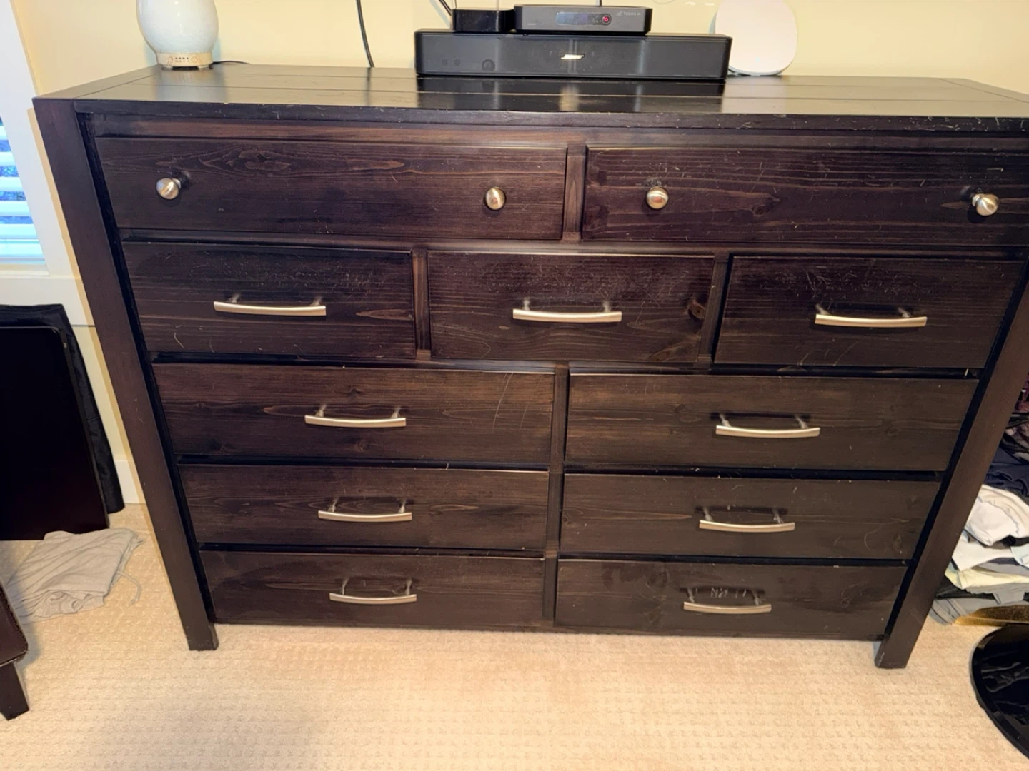 This is a dark wood dresser with ten drawers. It's made of solid wood. This dresser offers ample storage space for clothing and linens.