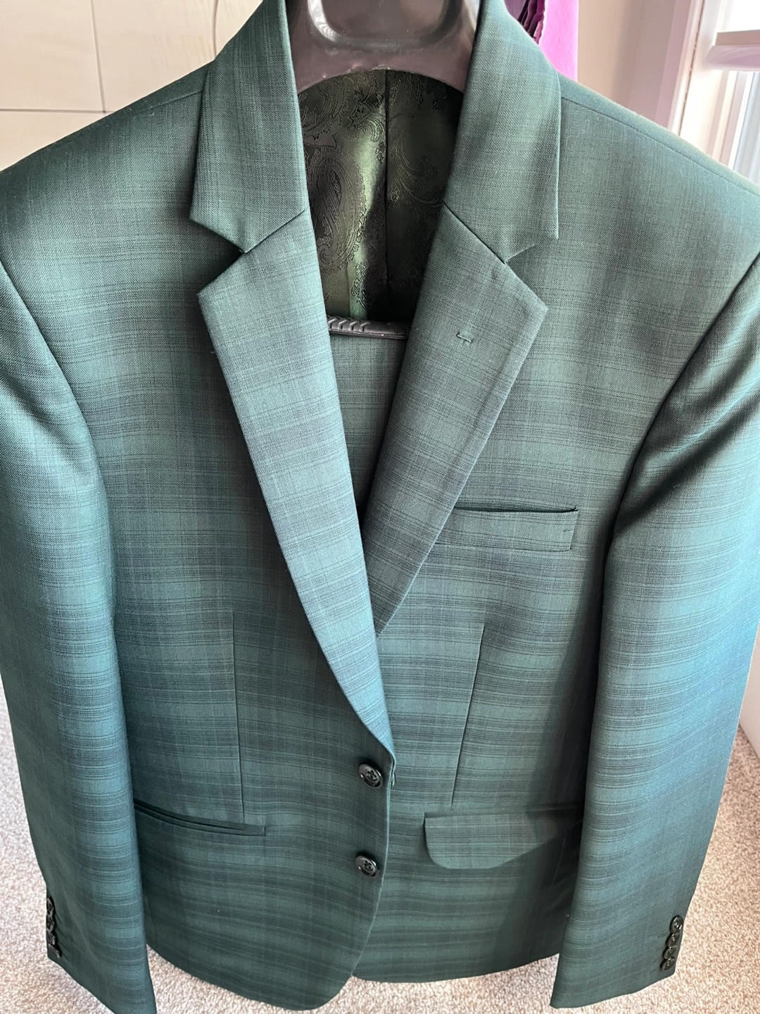 Slim-fitting two-piece suit. Dark teal green colour. Subtle check pattern. Three-button jacket. Fully lined. Matching trousers included. Excellent condition.