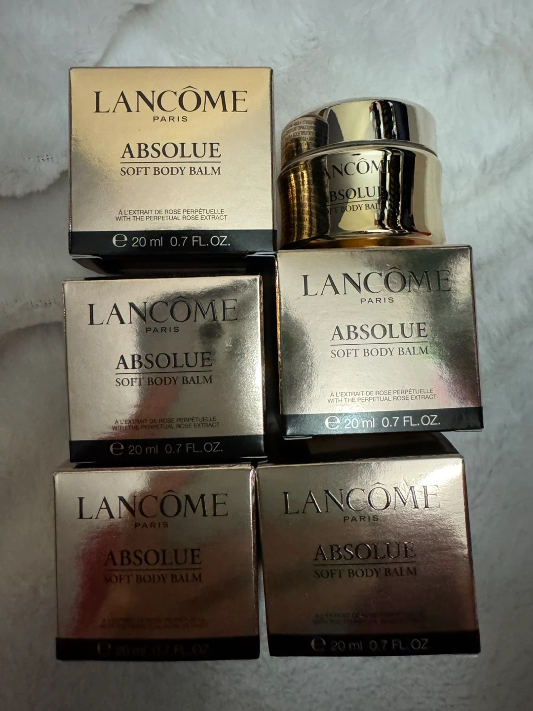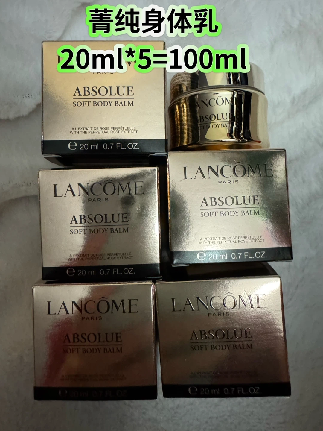 Five jars of Lancôme Absolue Soft Body Balm, each 20ml. This balm contains rose perpetual and rose extract. Great for keeping skin soft and hydrated.$10 each, or $48/5.