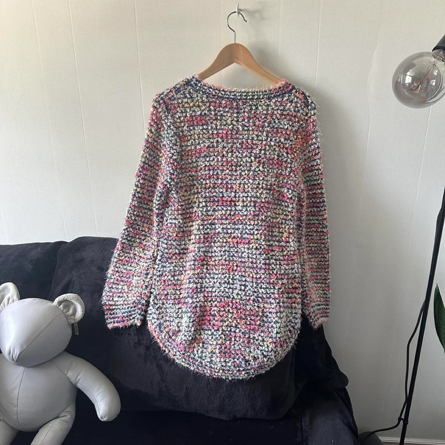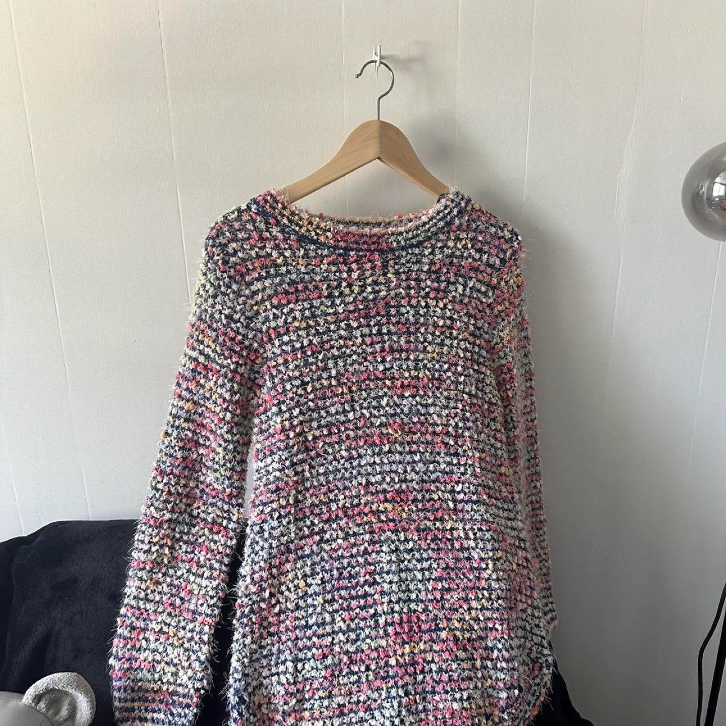 This is a colourful, textured knit sweater. It has a fuzzy yarn with flecks of pink, yellow, and blue throughout. The sweater has a relaxed fit.