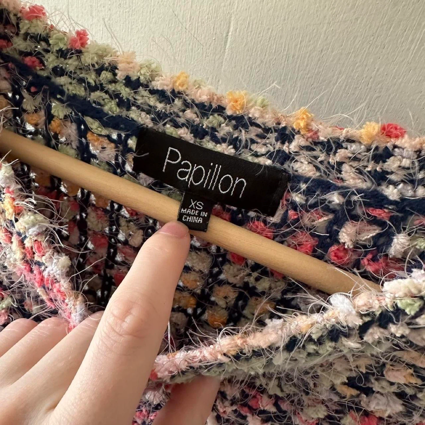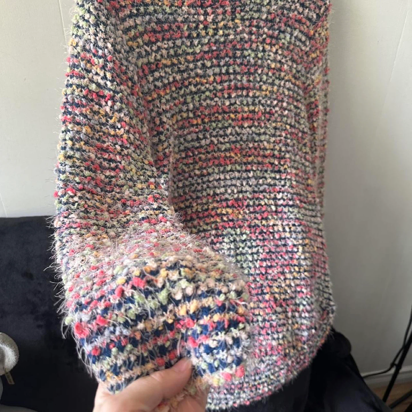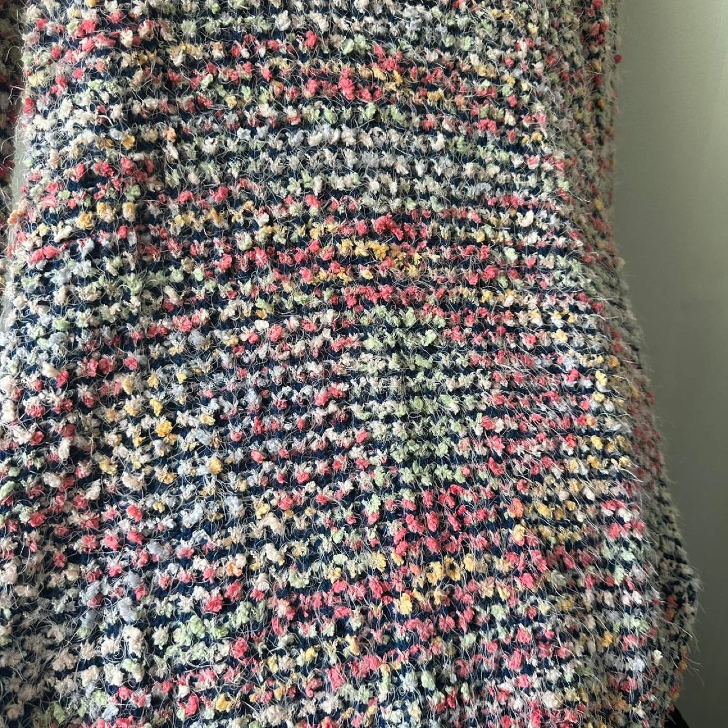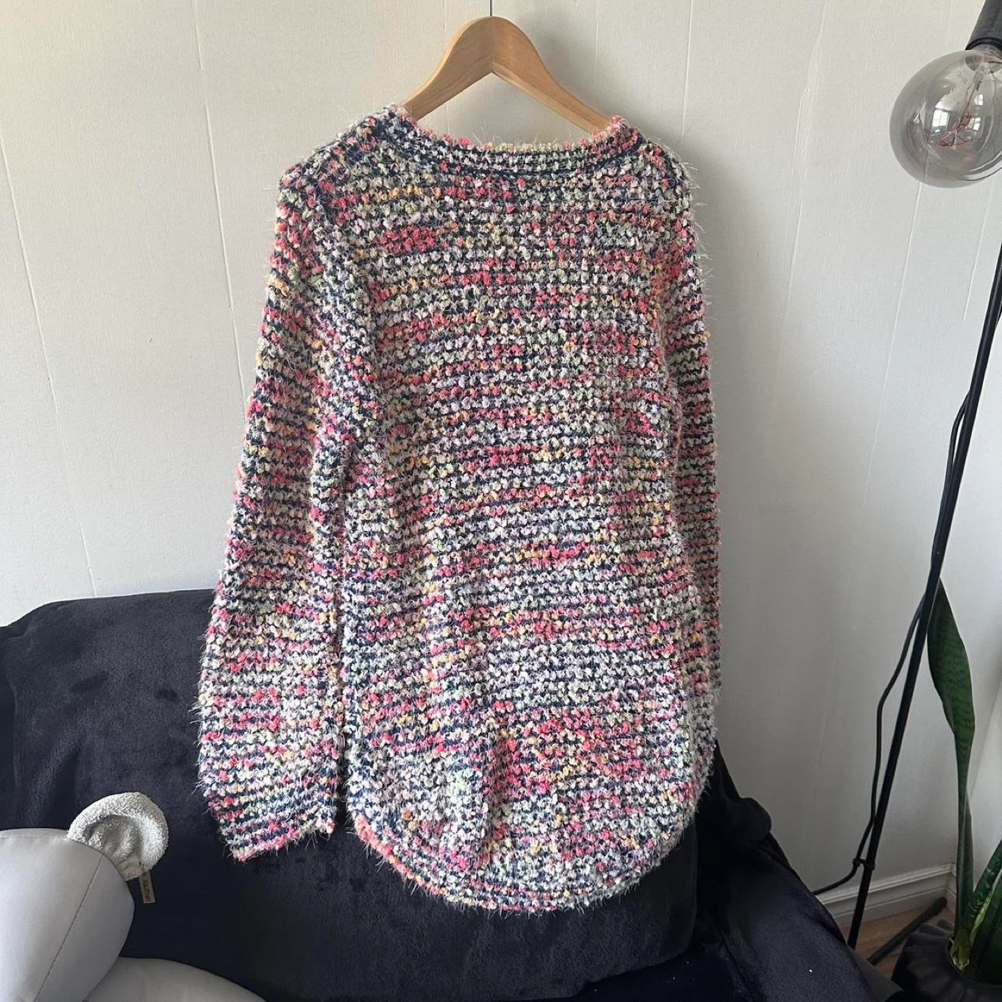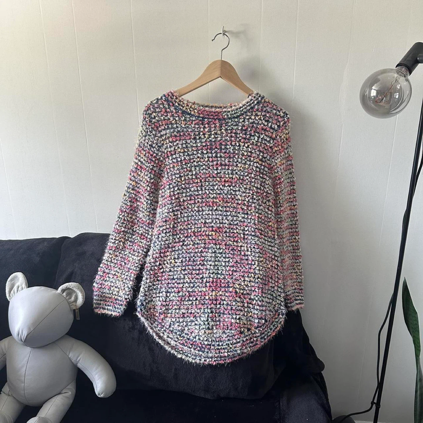 This is a colourful, textured knit sweater. It has a fuzzy yarn with flecks of pink, yellow, and blue throughout. The sweater has a relaxed fit.