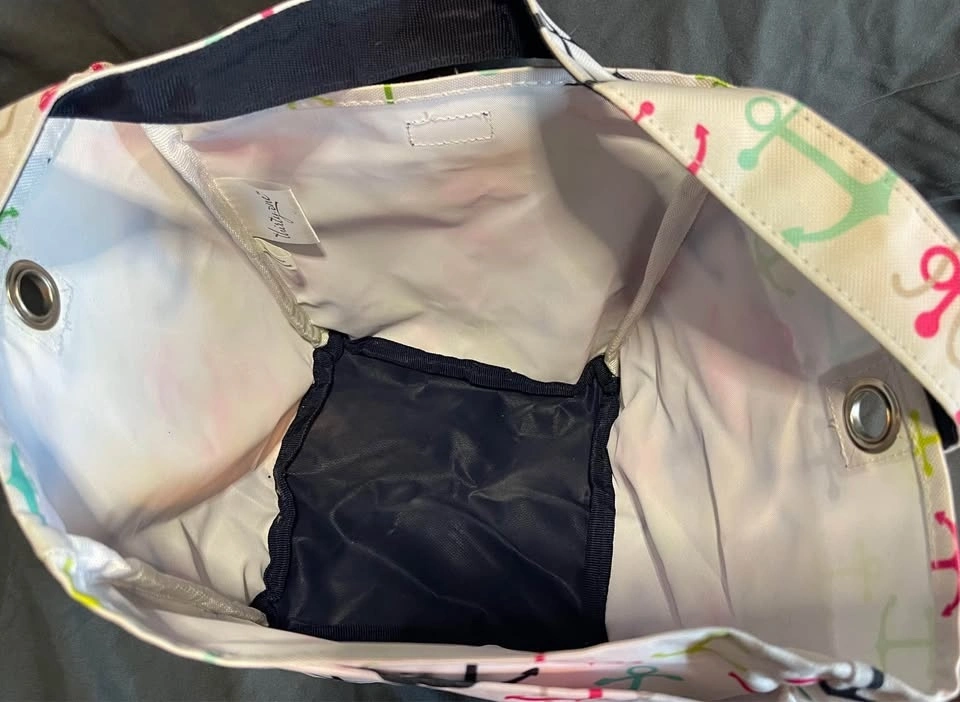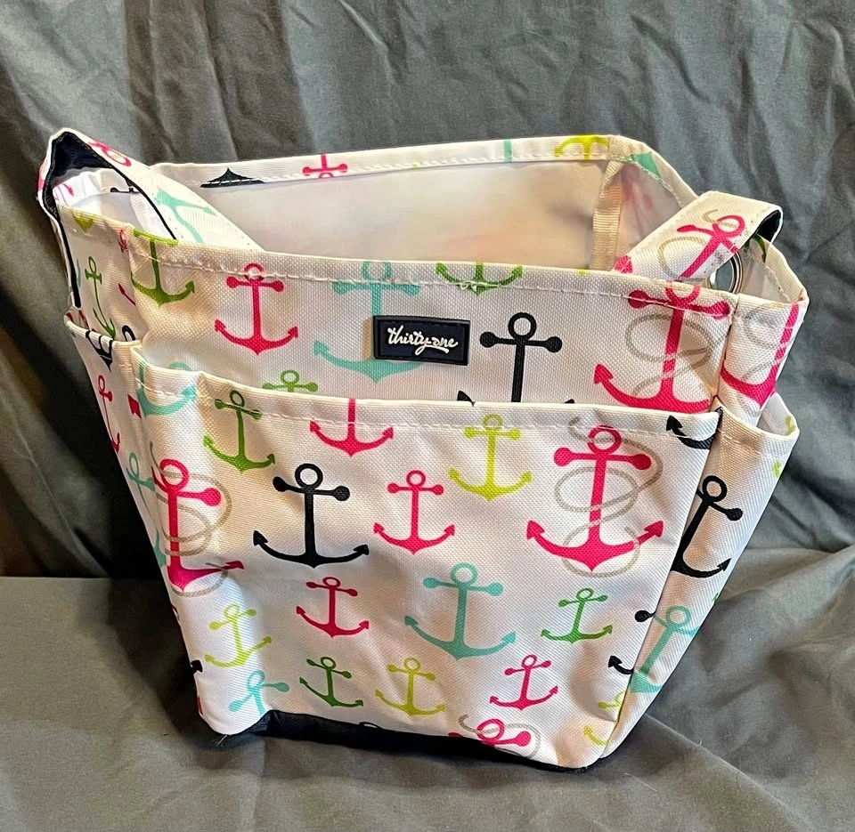 Cute Thirty-One round caddy. Has a fun colorful anchor pattern in pink, green, blue, and black. Multiple exterior pockets. Inside has a dark blue base. Pickup in Airdrie.