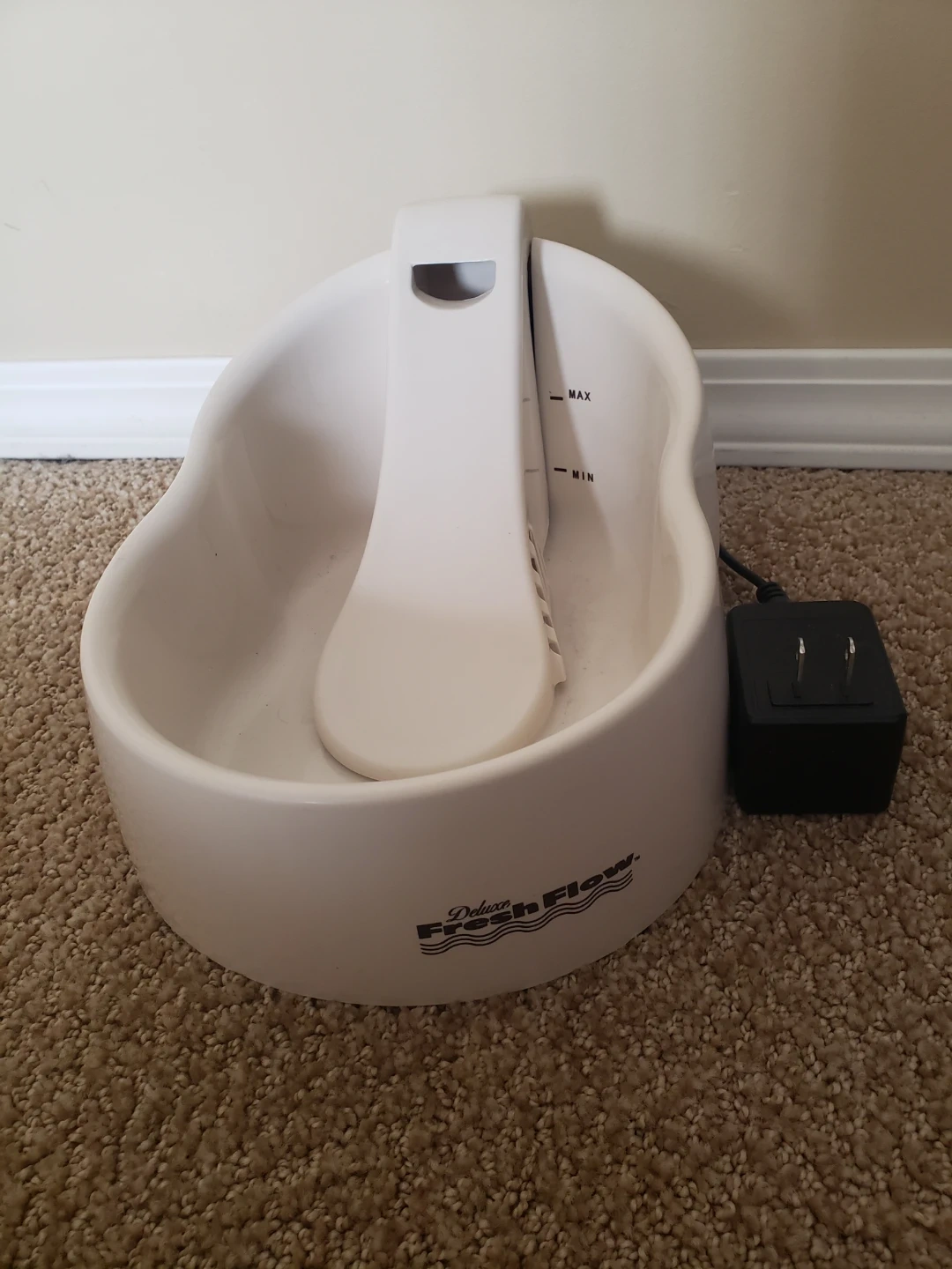 This is a Deluxe Fresh Flow pet water fountain. It has a white ceramic bowl with "MIN" and "MAX" water level indicators. Includes the power adapter.