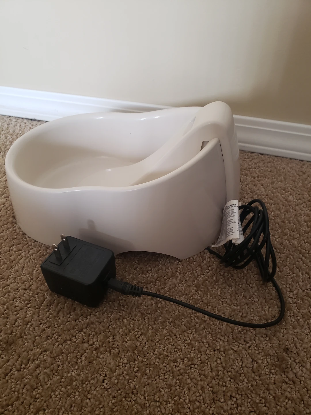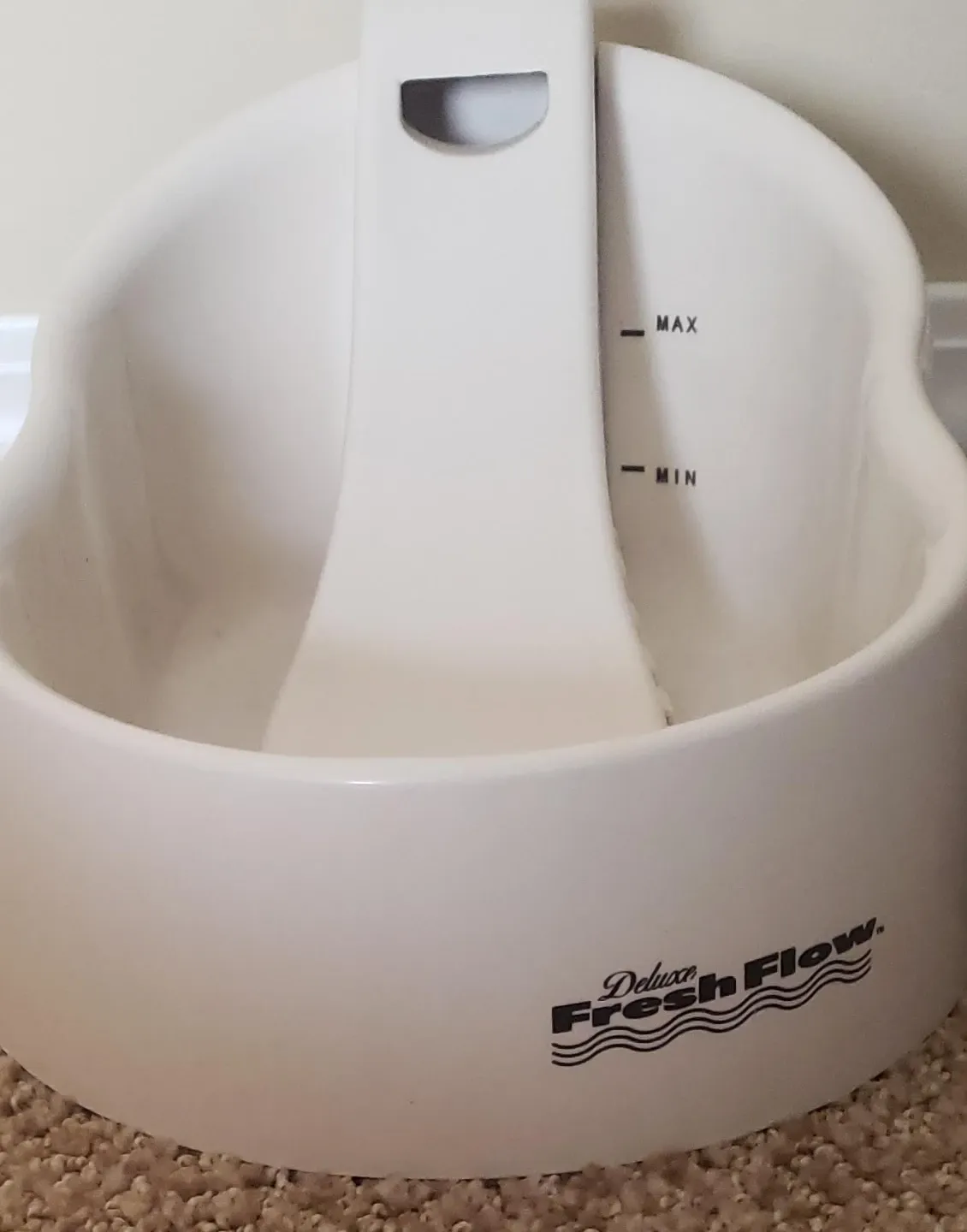 This is a Deluxe Fresh Flow pet water fountain. It has a white ceramic bowl with "MIN" and "MAX" water level indicators. Includes the power adapter.