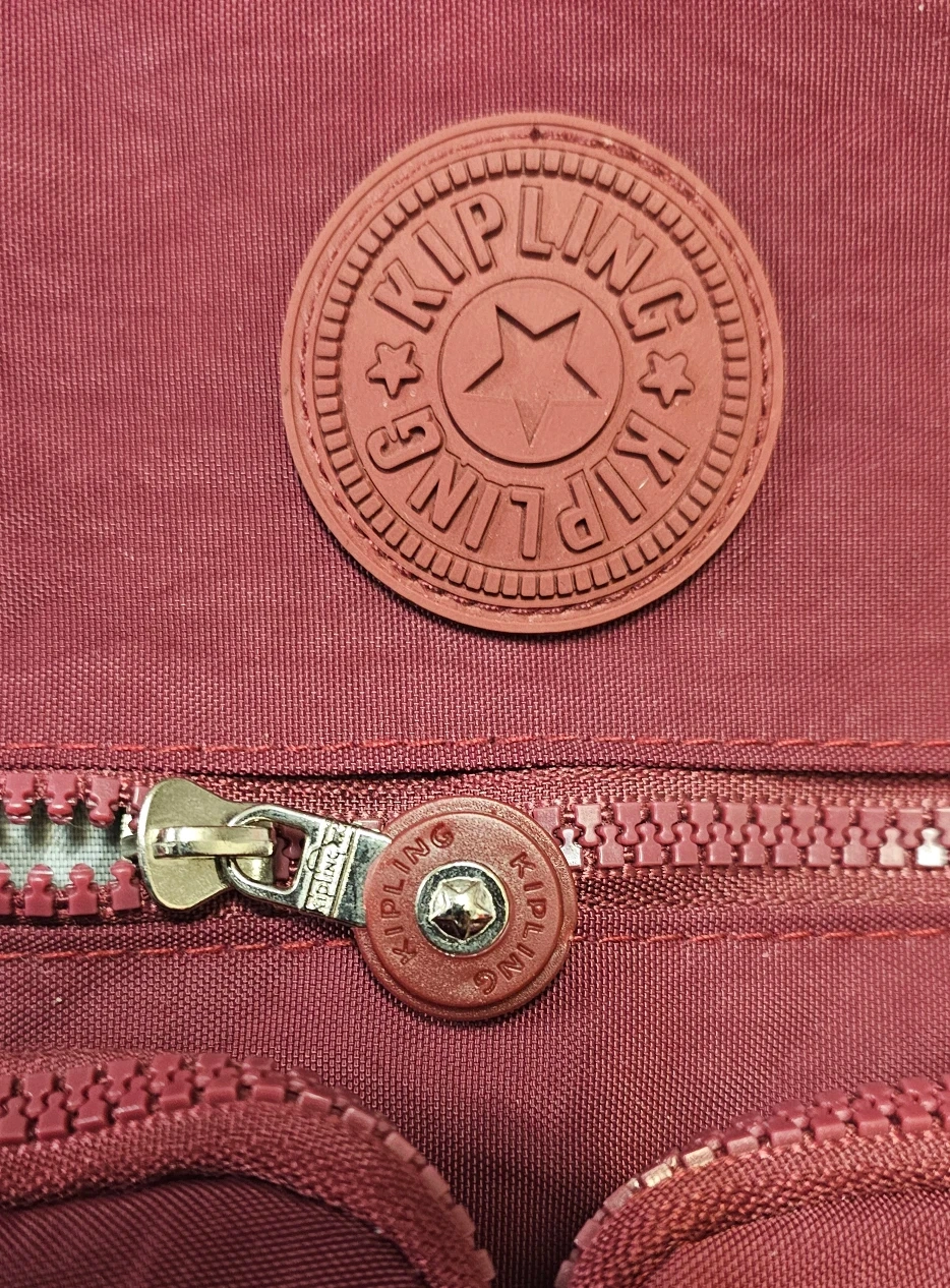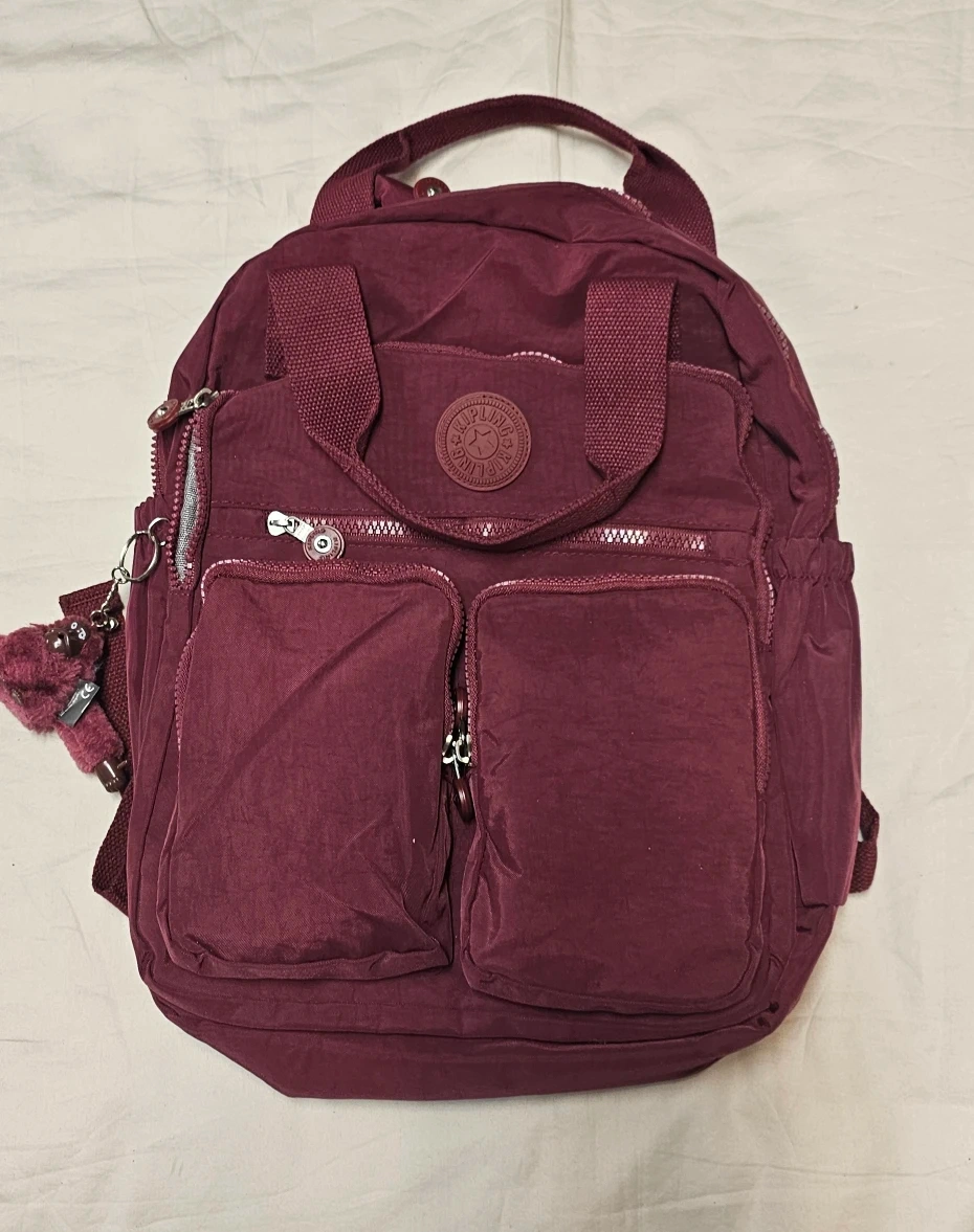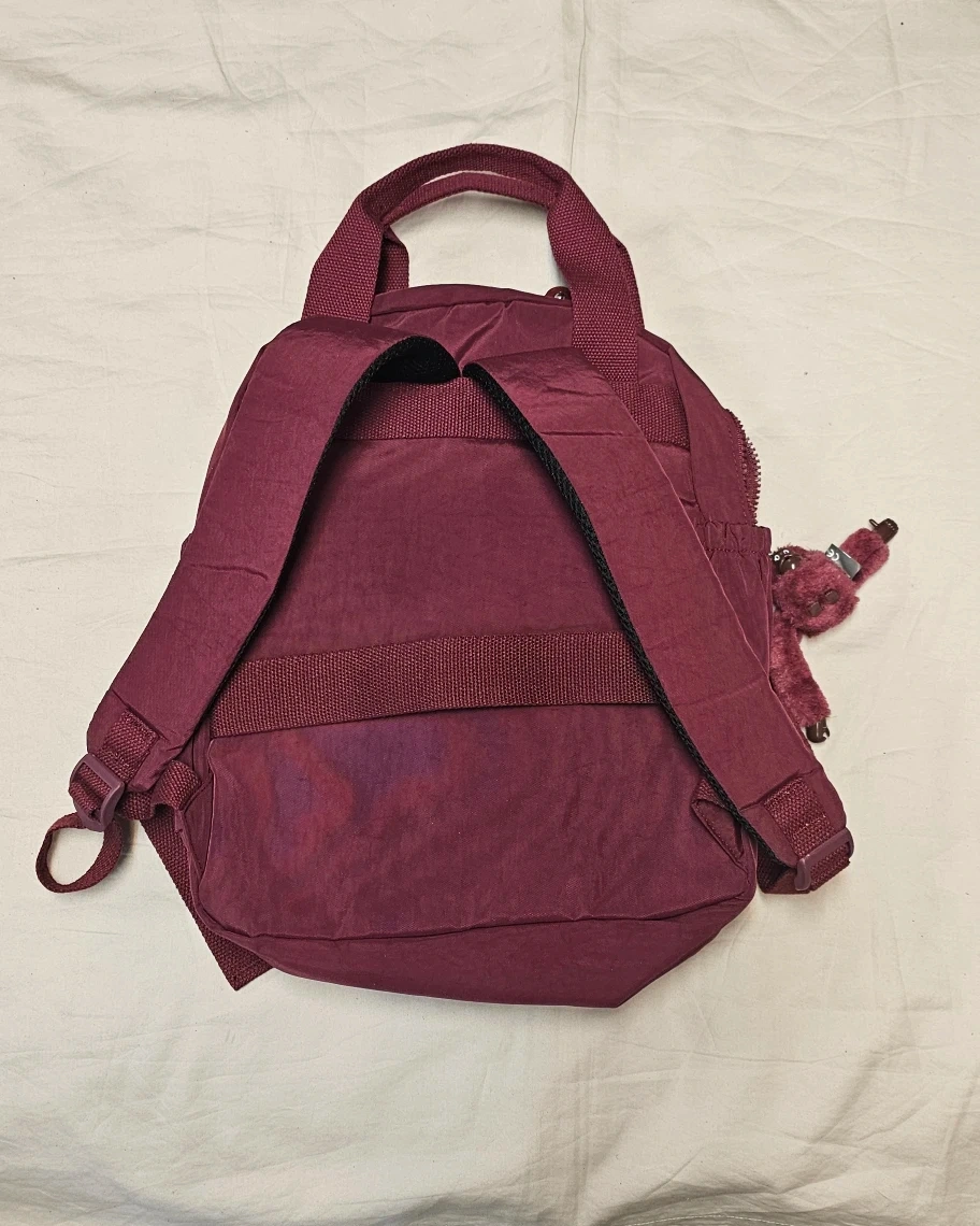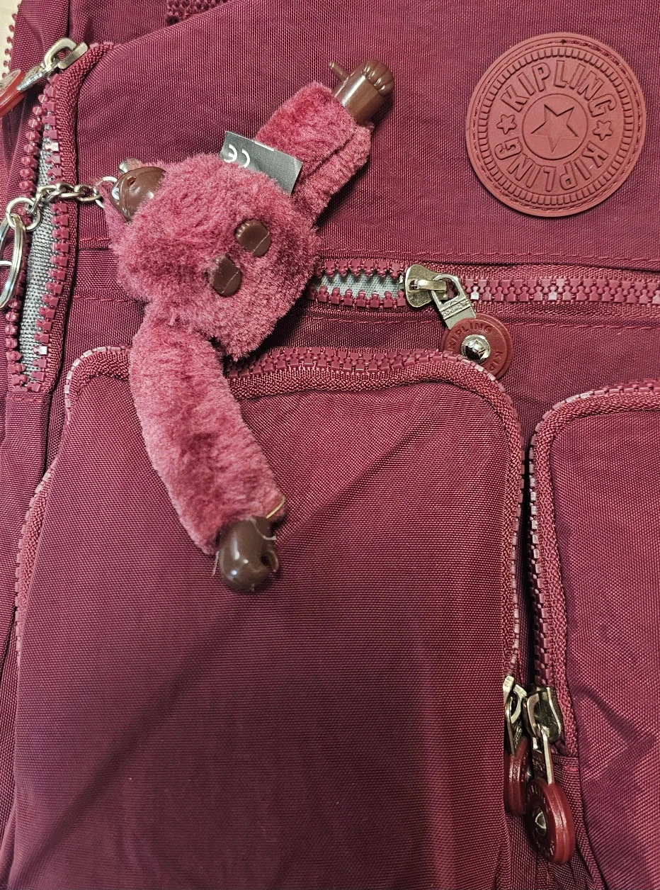 This is a Kipling backpack in a burgundy colour. Has only been used twice in mint condition. Super clean inside and out. It features multiple zippered pockets on the front and a fuzzy monkey keychain. The interior lining has a patterned design.