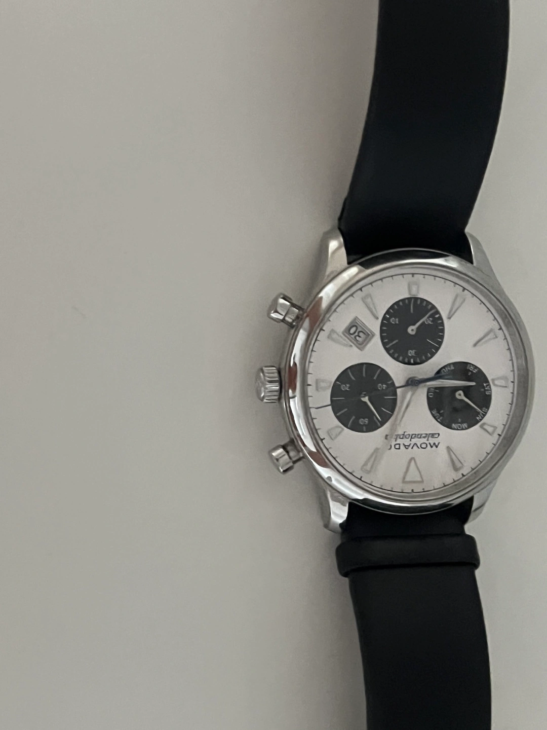 Selling a Movado Datron chronograph watch with a black leather strap. It's in great shape and ready for a new home! The watch features a stainless steel case and a clean, easy-to-read dial. Perfect for everyday wear or special occasions