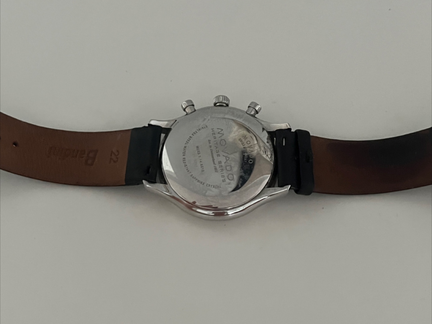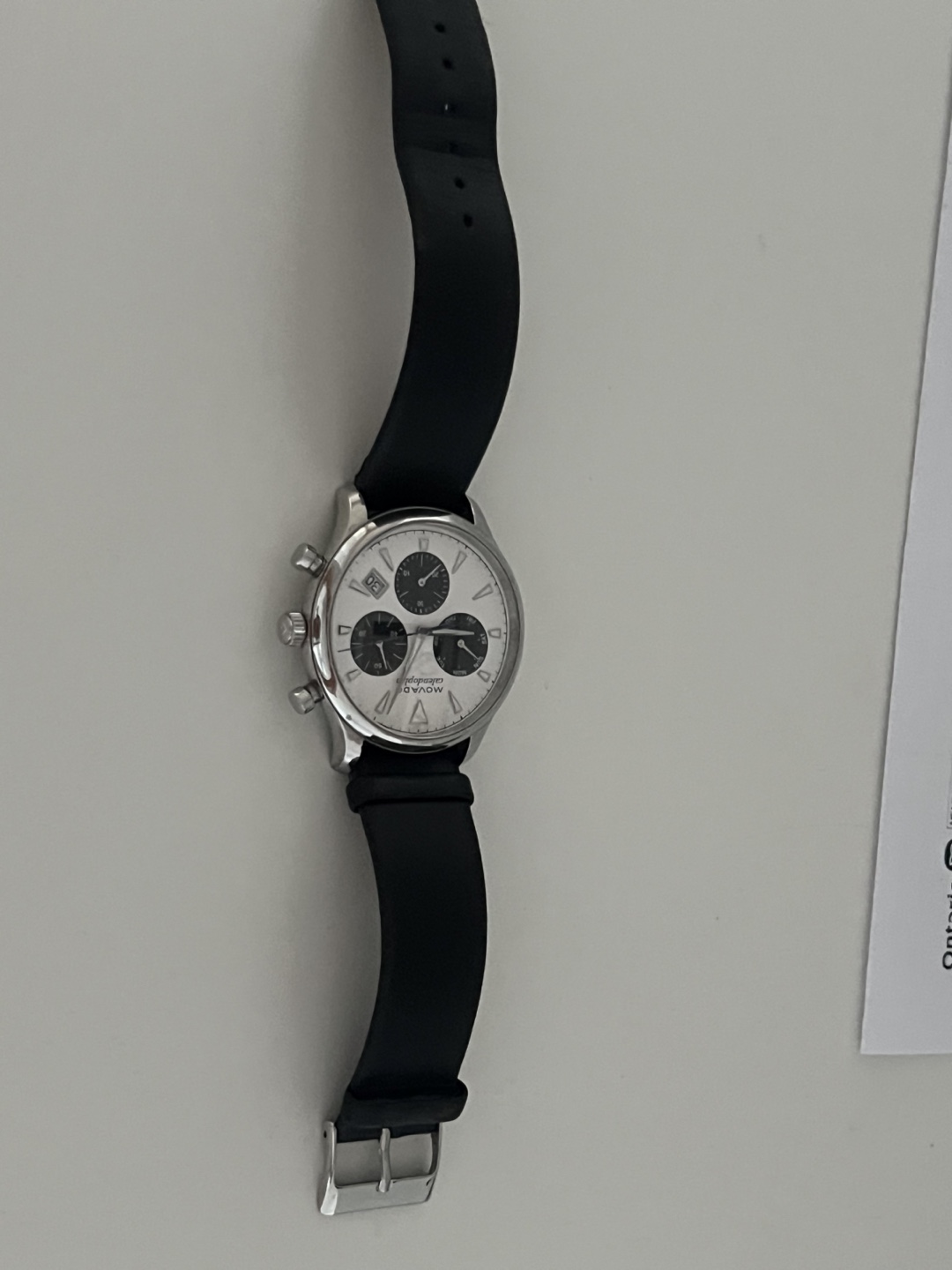Selling a Movado Datron chronograph watch with a black leather strap. It's in great shape and ready for a new home! The watch features a stainless steel case and a clean, easy-to-read dial. Perfect for everyday wear or special occasions