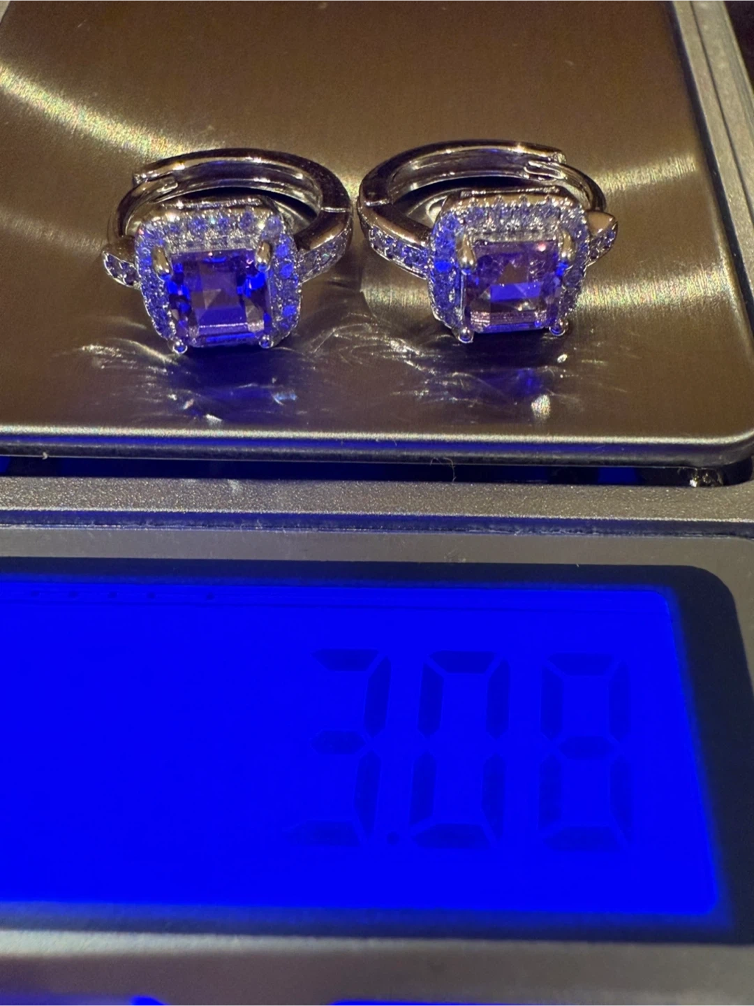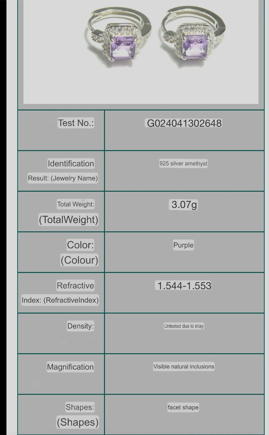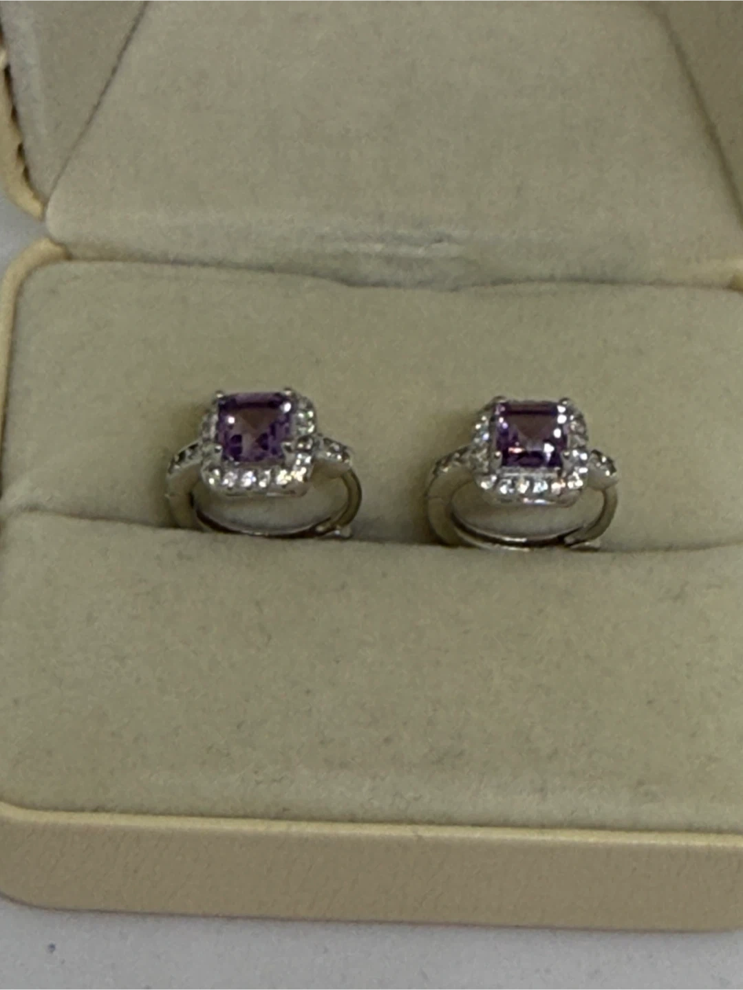 Selling a pair of S925 silver purple amethyst earrings. The stones have visible natural inclusions. Each earring weighs 3.07g and has a facet shape. They are in brand new condition!