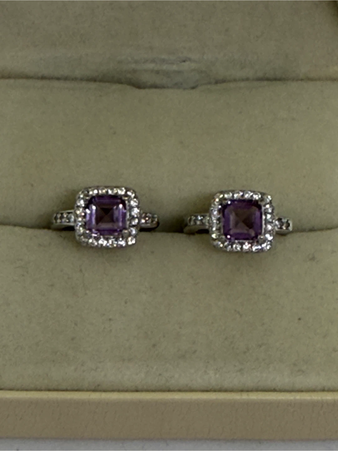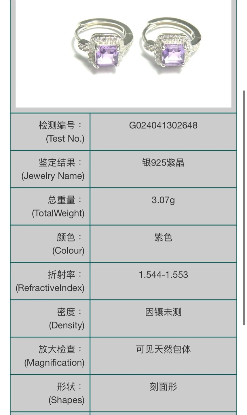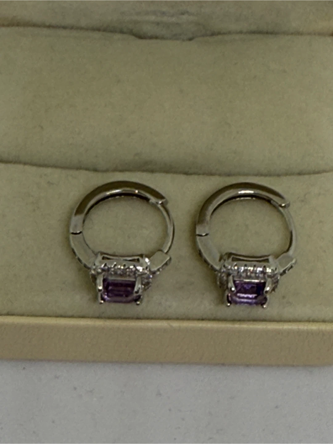 Selling a pair of S925 silver purple amethyst earrings. The stones have visible natural inclusions. Each earring weighs 3.07g and has a facet shape. They are in brand new condition!