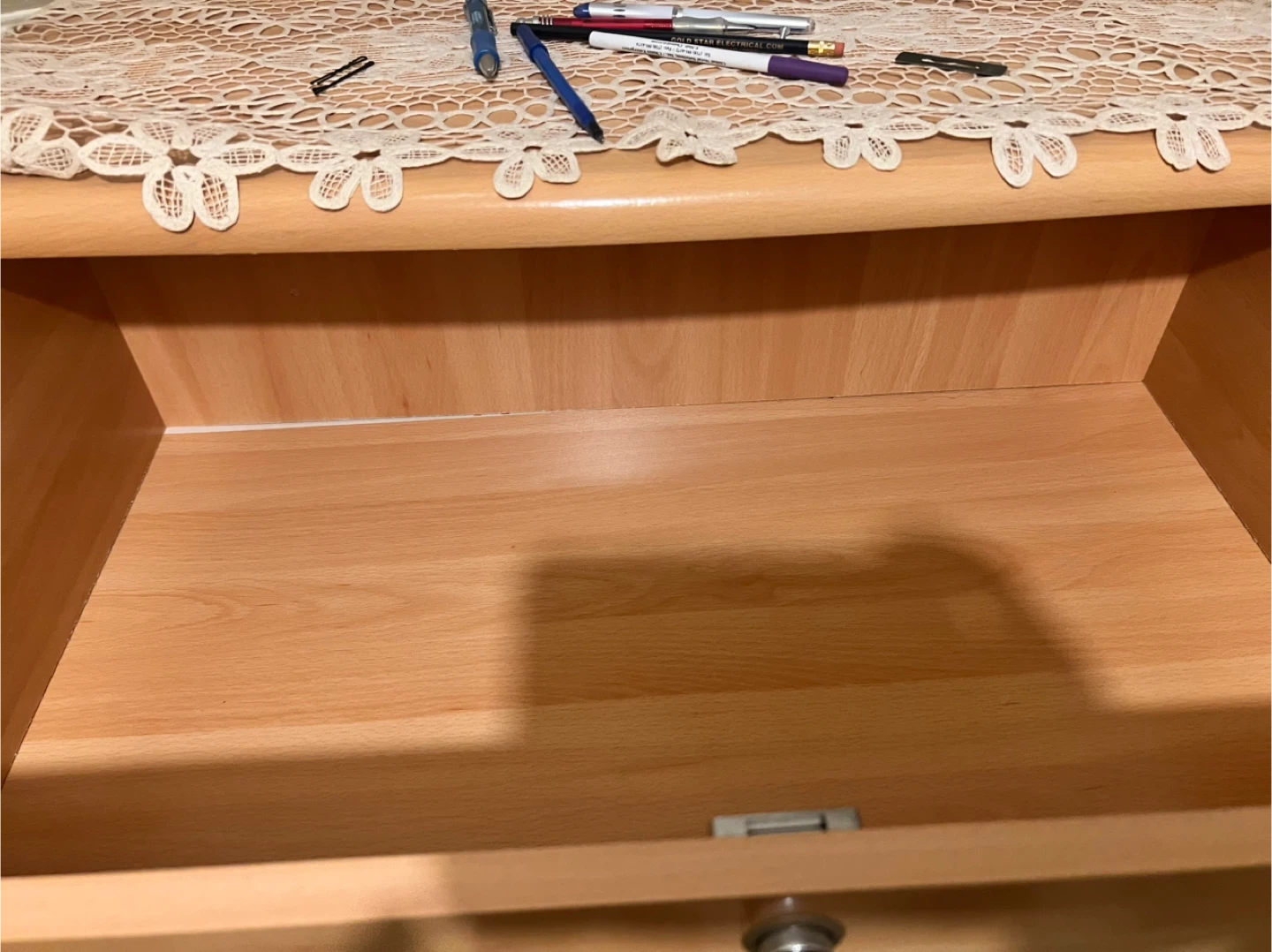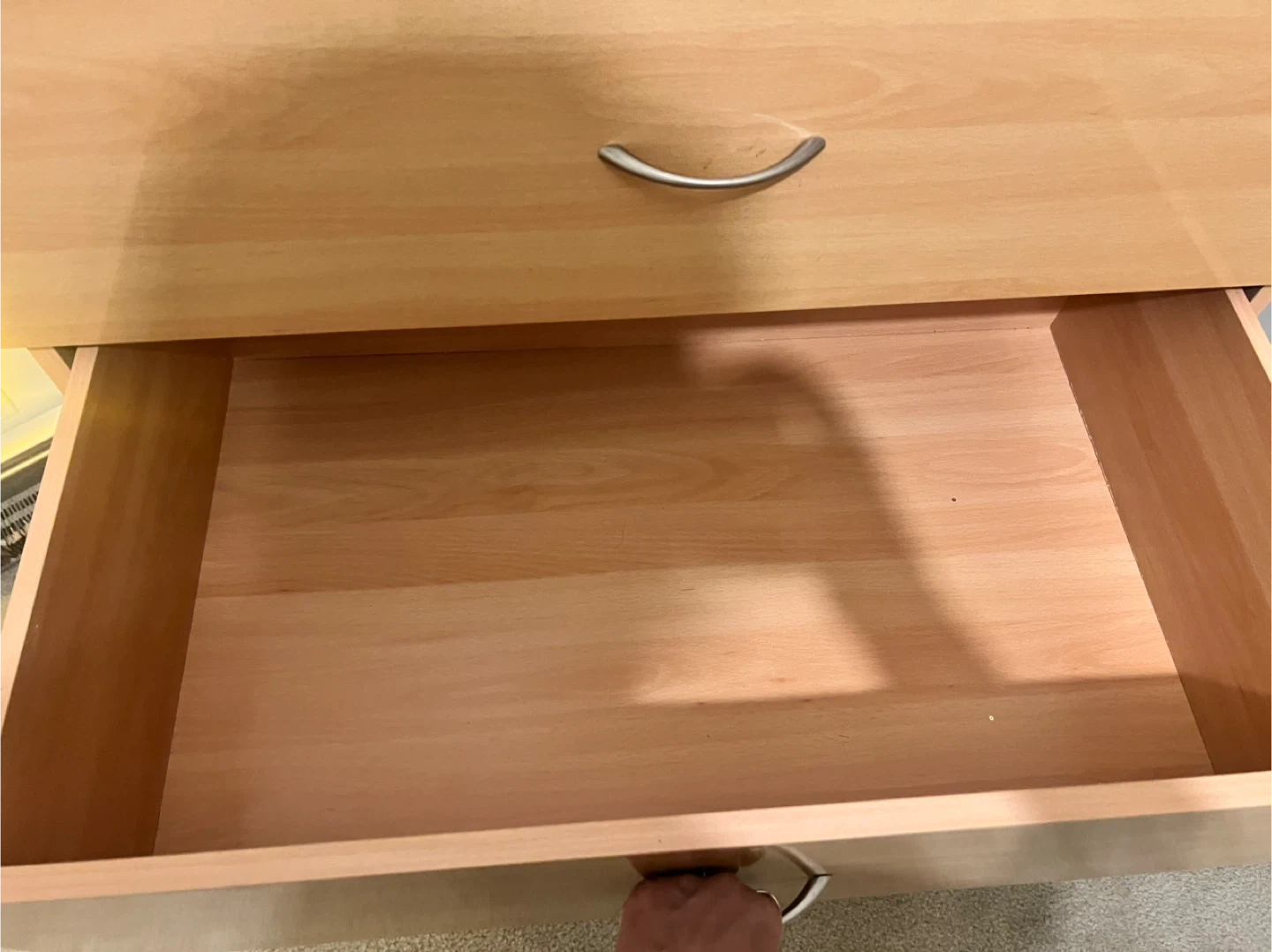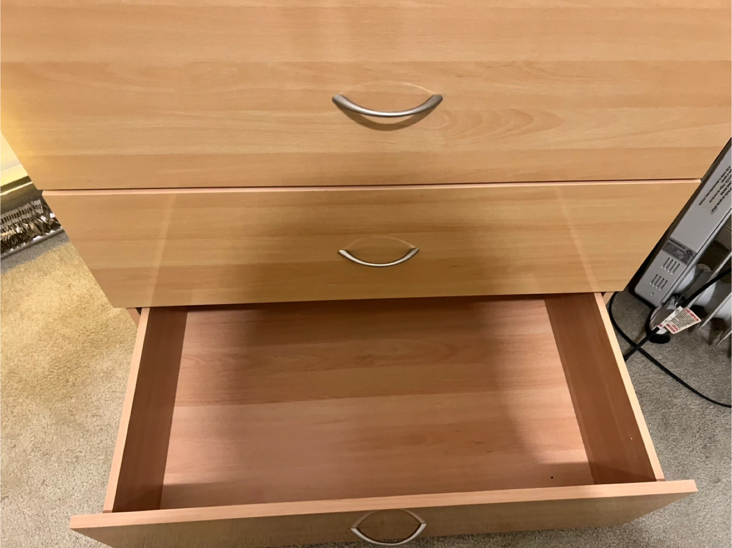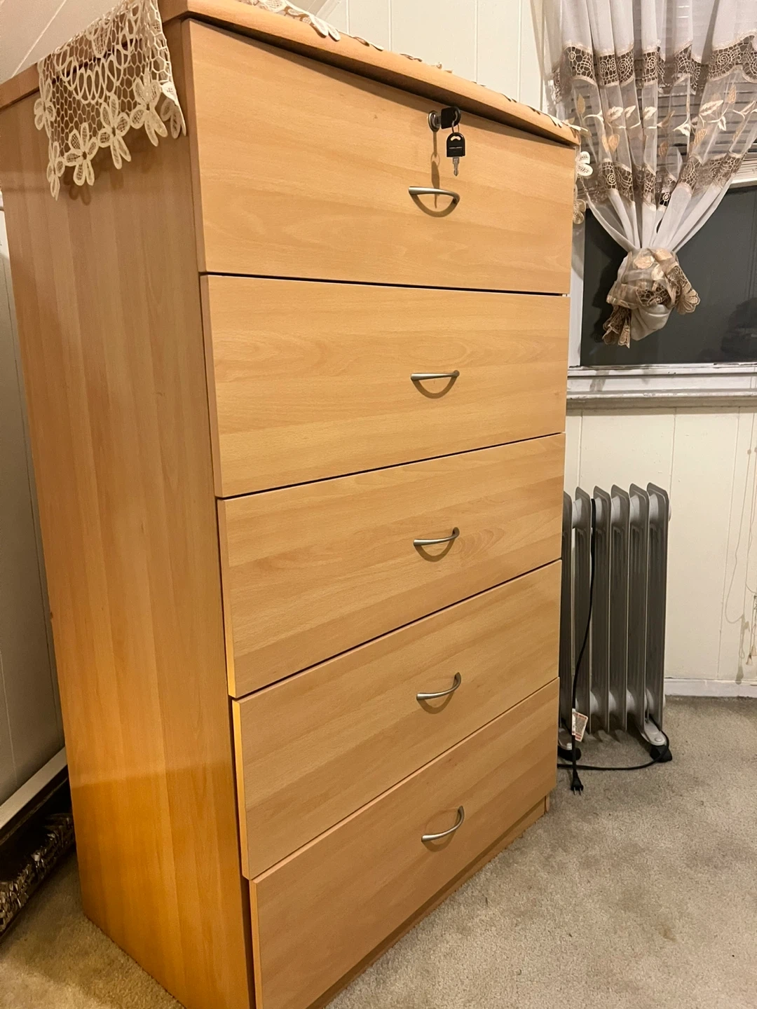 Here's a wooden dresser with five drawers! It's a great piece for adding storage to any room. The drawers slide smoothly, making it easy to access your items. It's in good condition and ready for a new home