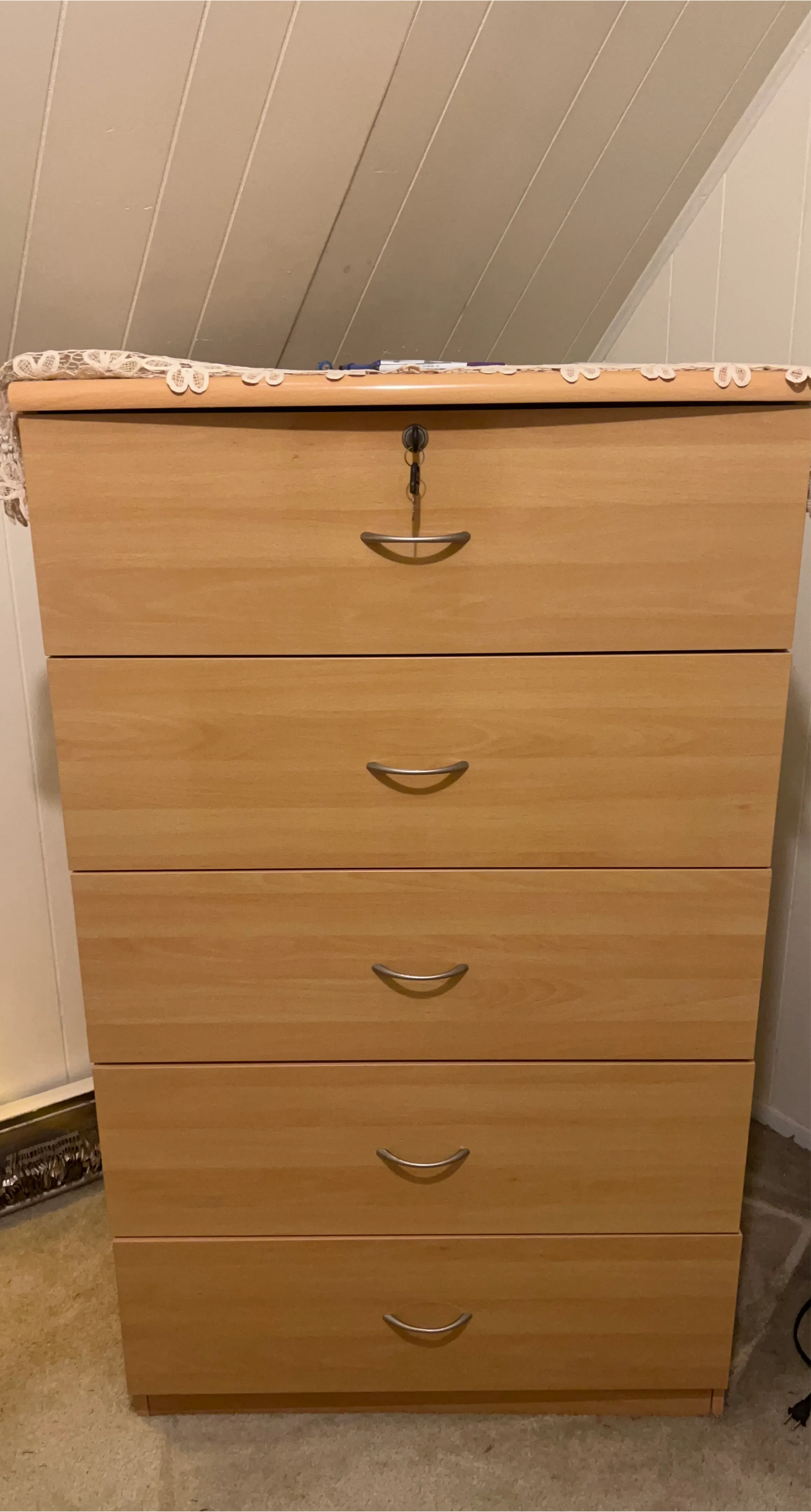 Here's a wooden dresser with five drawers! It's a great piece for adding storage to any room. The drawers slide smoothly, making it easy to access your items. It's in good condition and ready for a new home