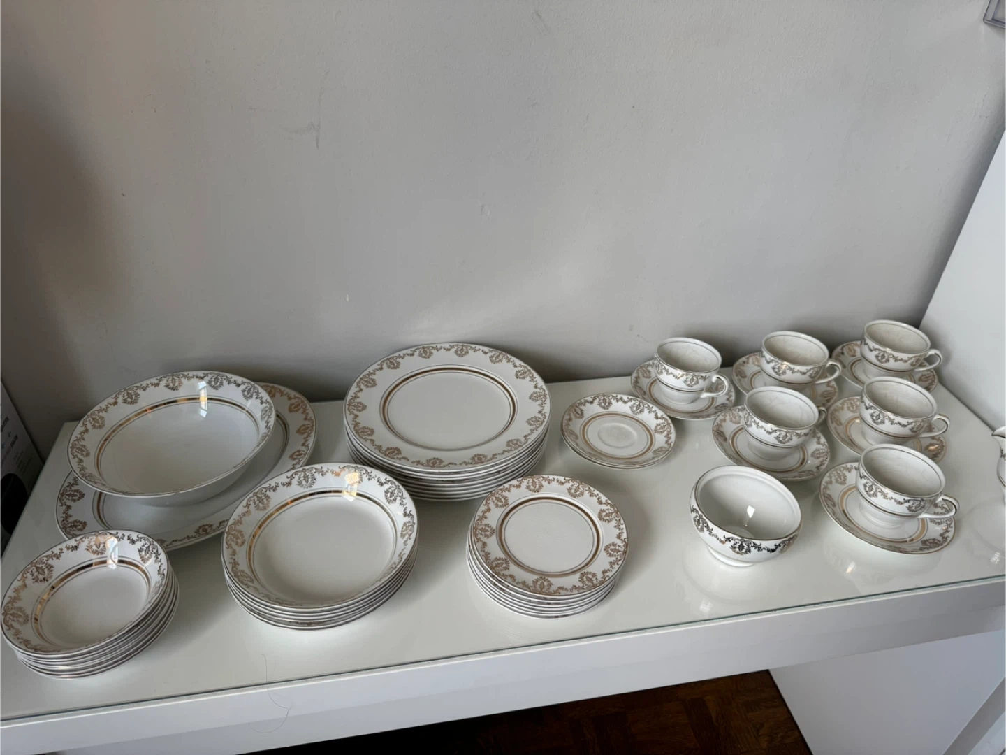Selling a beautiful vintage dinnerware set! It features a delicate white and gold pattern. The set includes plates, bowls, cups, and saucers, perfect for adding a touch of elegance to any dining experience
