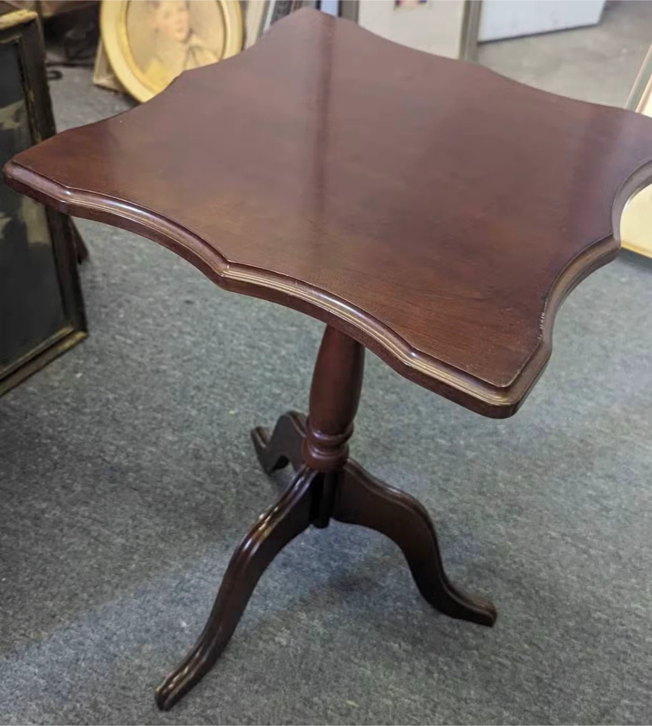 This is a lovely accent table from The Bombay Company. It's made of dark wood and features a classic pedestal base with three legs. The table has a scalloped edge top, perfect for displaying a lamp or decorative items. It's a great size for small spaces or to tuck into a corner!