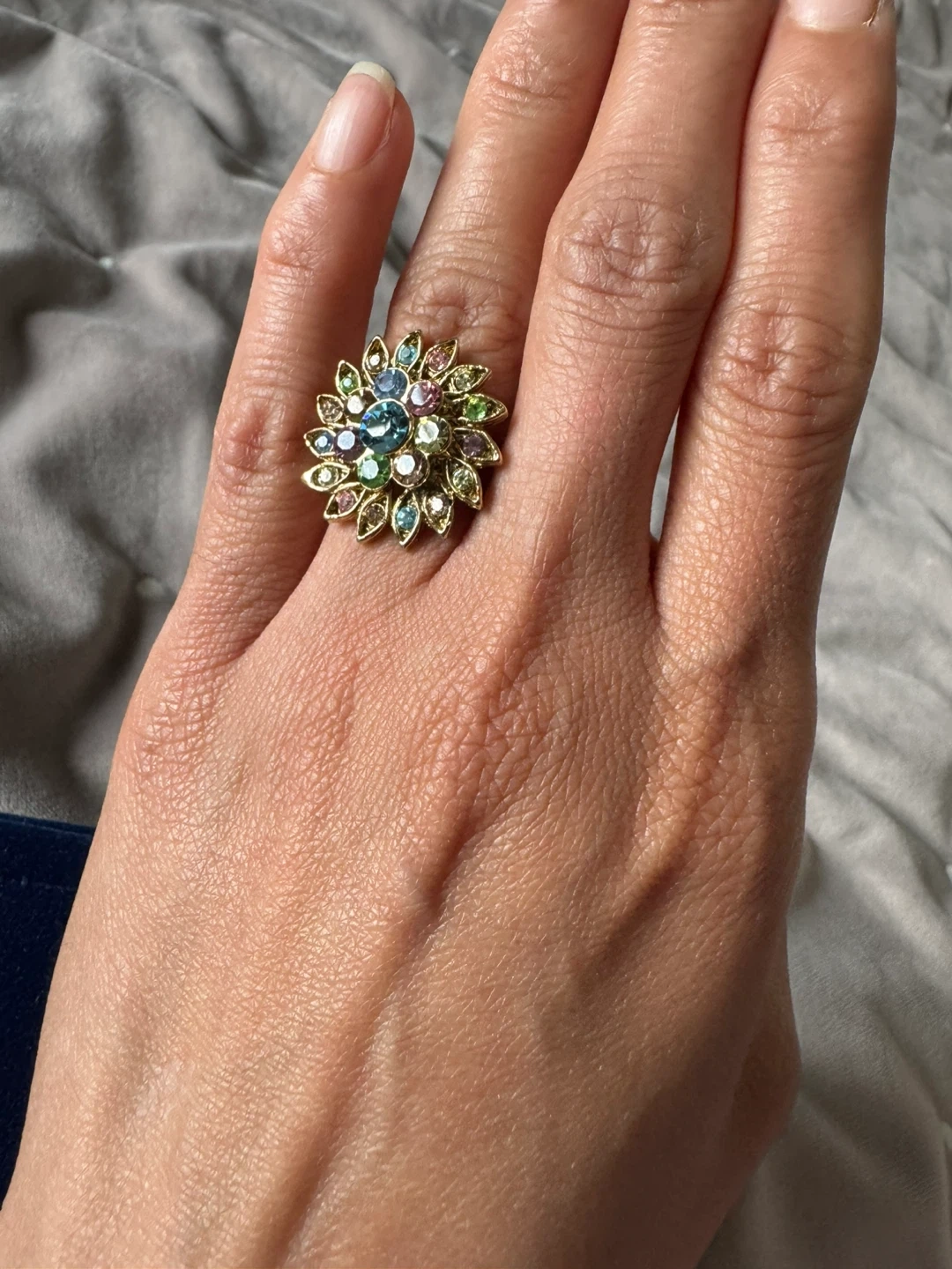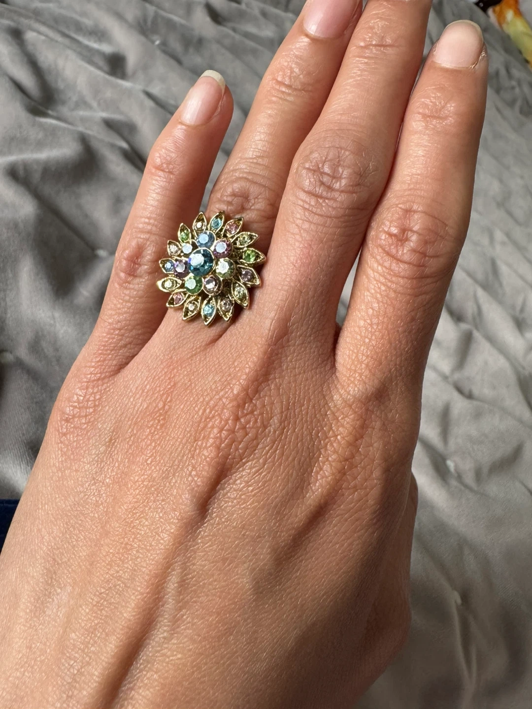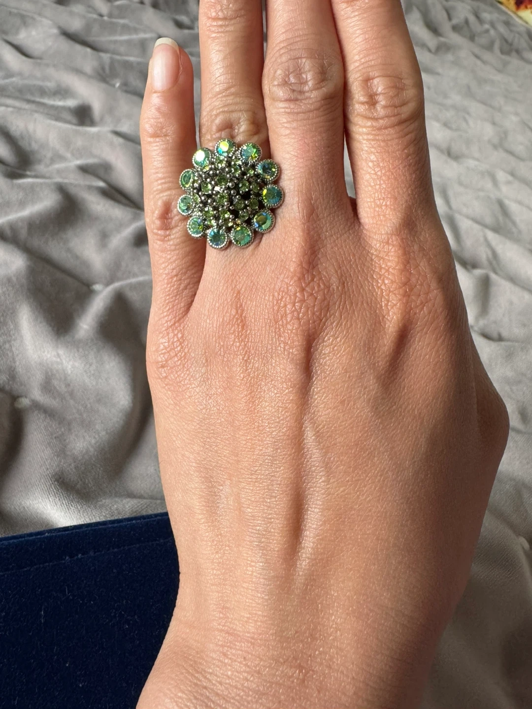 Sparkly floral statement ring featuring green and blue faceted stones. It's set in a gold-toned metal with a vintage-inspired design. This eye-catching piece adds a pop of colour to any outfit!