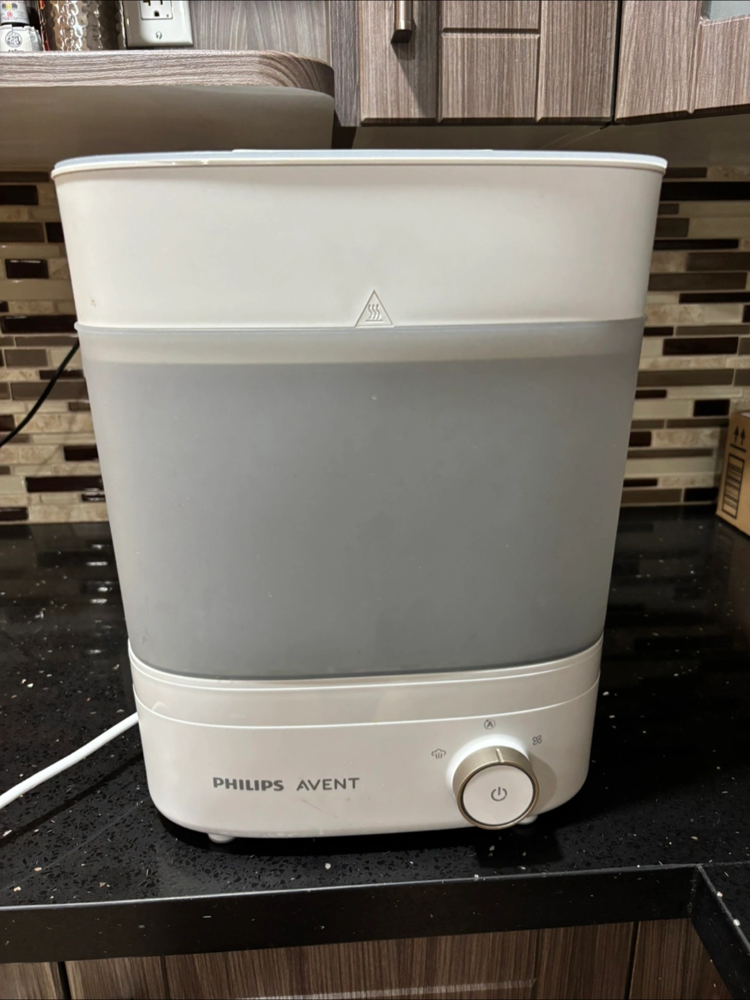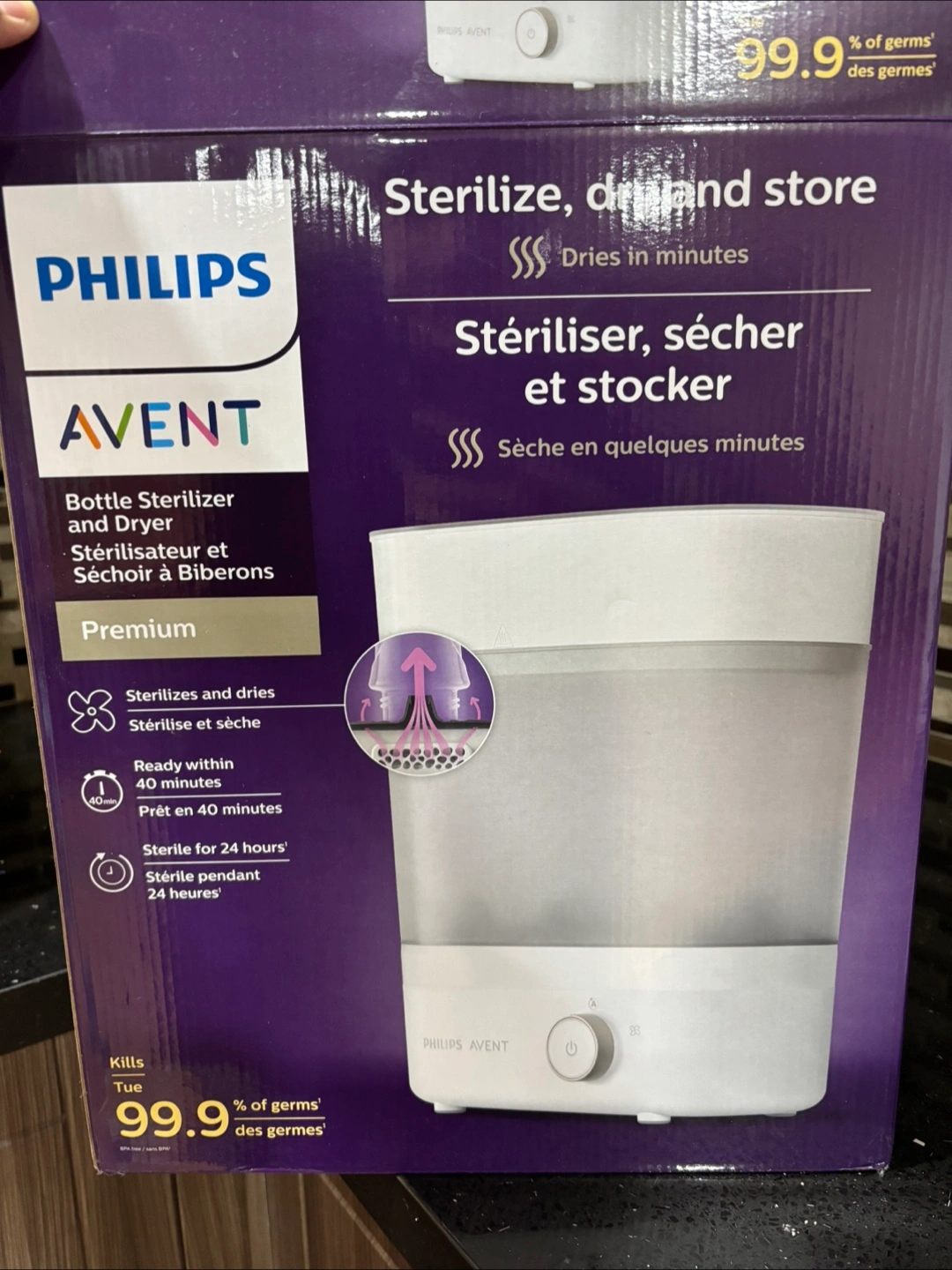 Selling a Philips Avent Bottle Sterilizer and Dryer! It sterilizes and dries in minutes, and it's ready in 40 minutes. It also sterilizes for 24 hours. Comes with all the components and the original box!