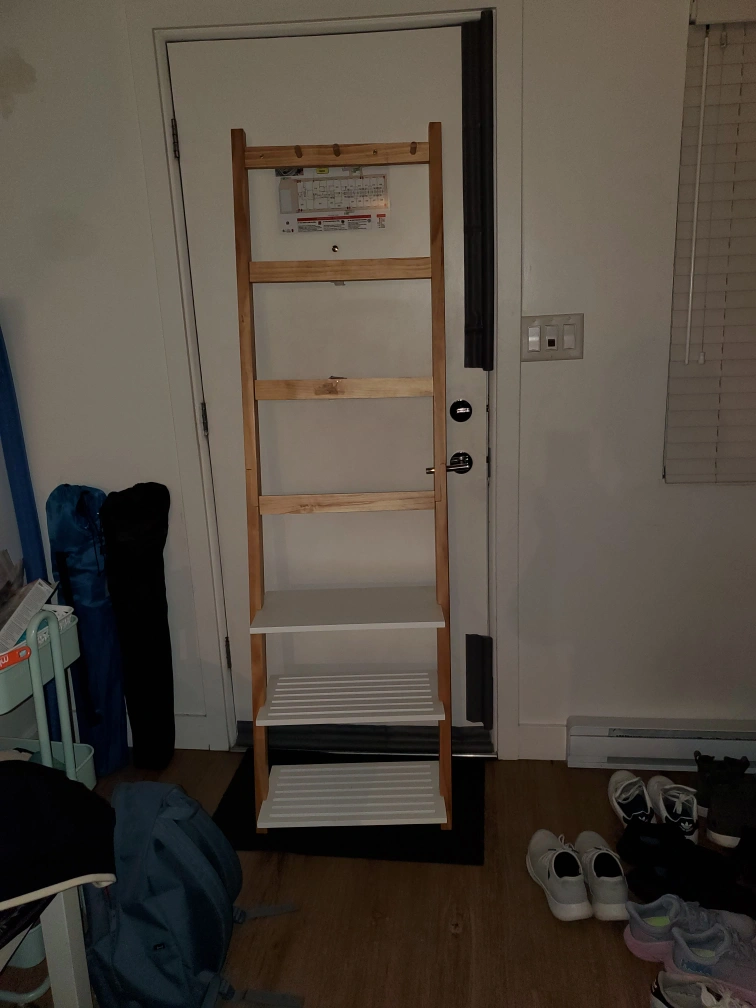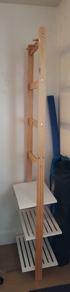Tall wooden shelf unit has a ladder-style design with lower shelves for shoes. Great for entryway organization. 2 of 5 Pegs missing $15, selling because we're moving and don't need it.