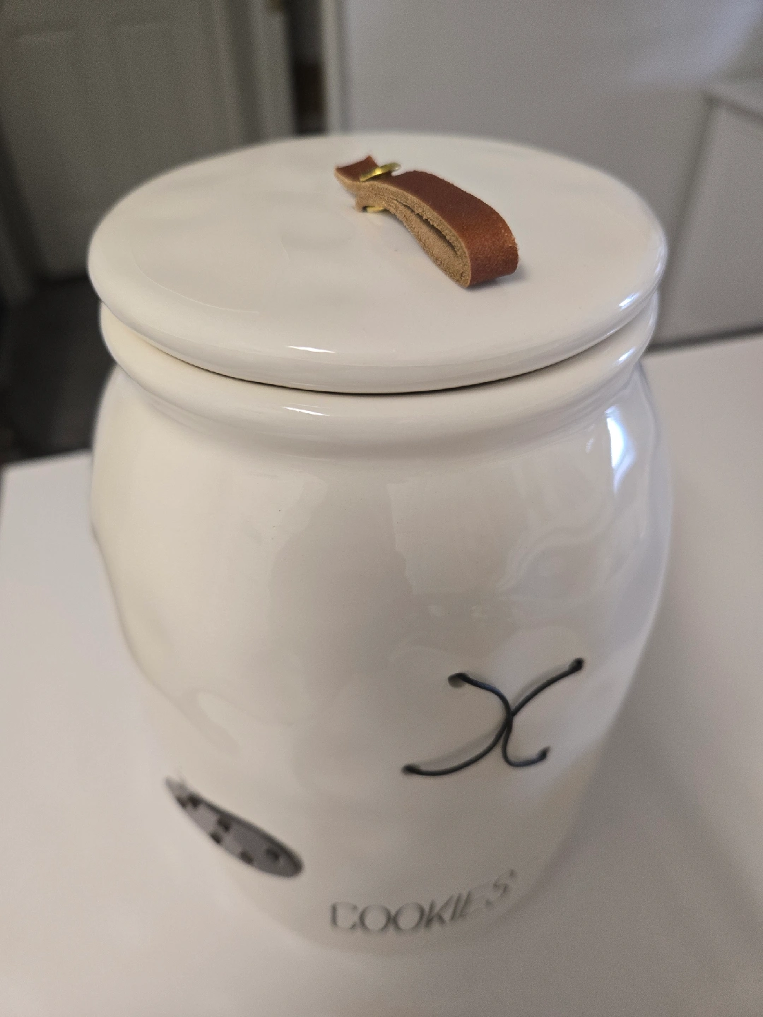 · Mottled ceramic cookie jar features debossed “COOKIES” sentiment.