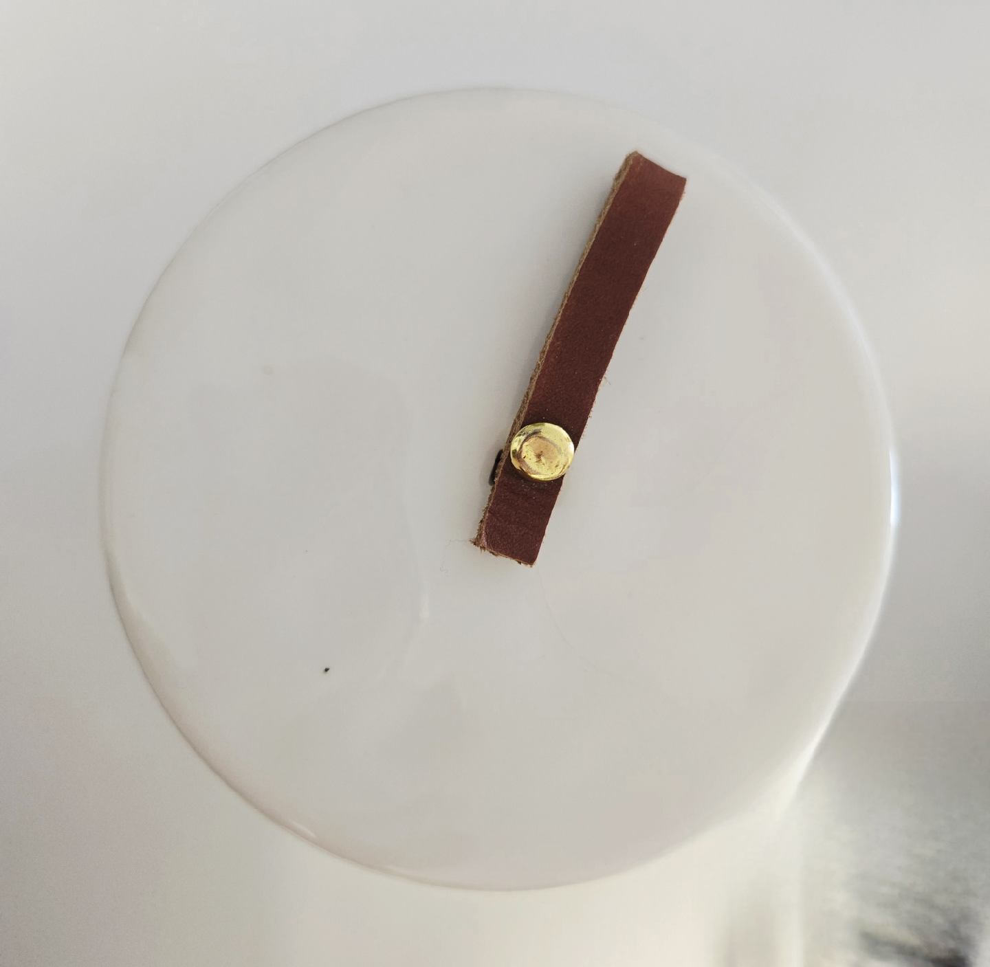 · Studded bronze accent plate, wire detail, and removable ceramic lid with faux leather loop handle and silicone seal.