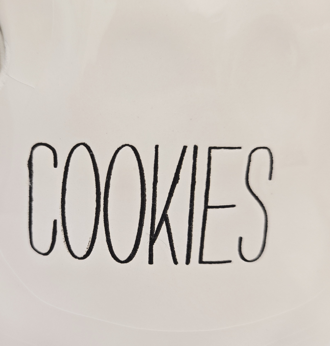 · Mottled ceramic cookie jar features debossed “COOKIES” sentiment.