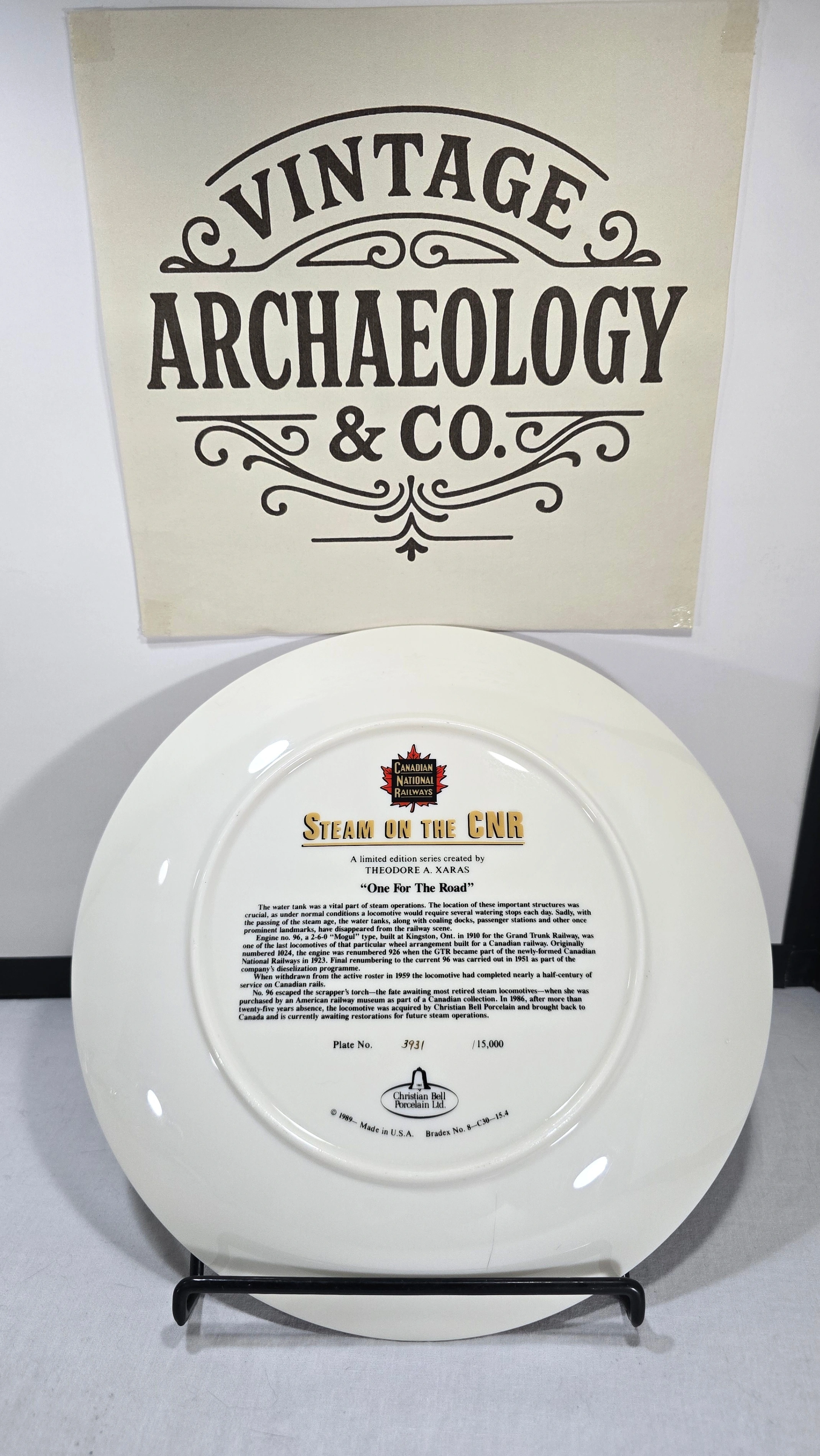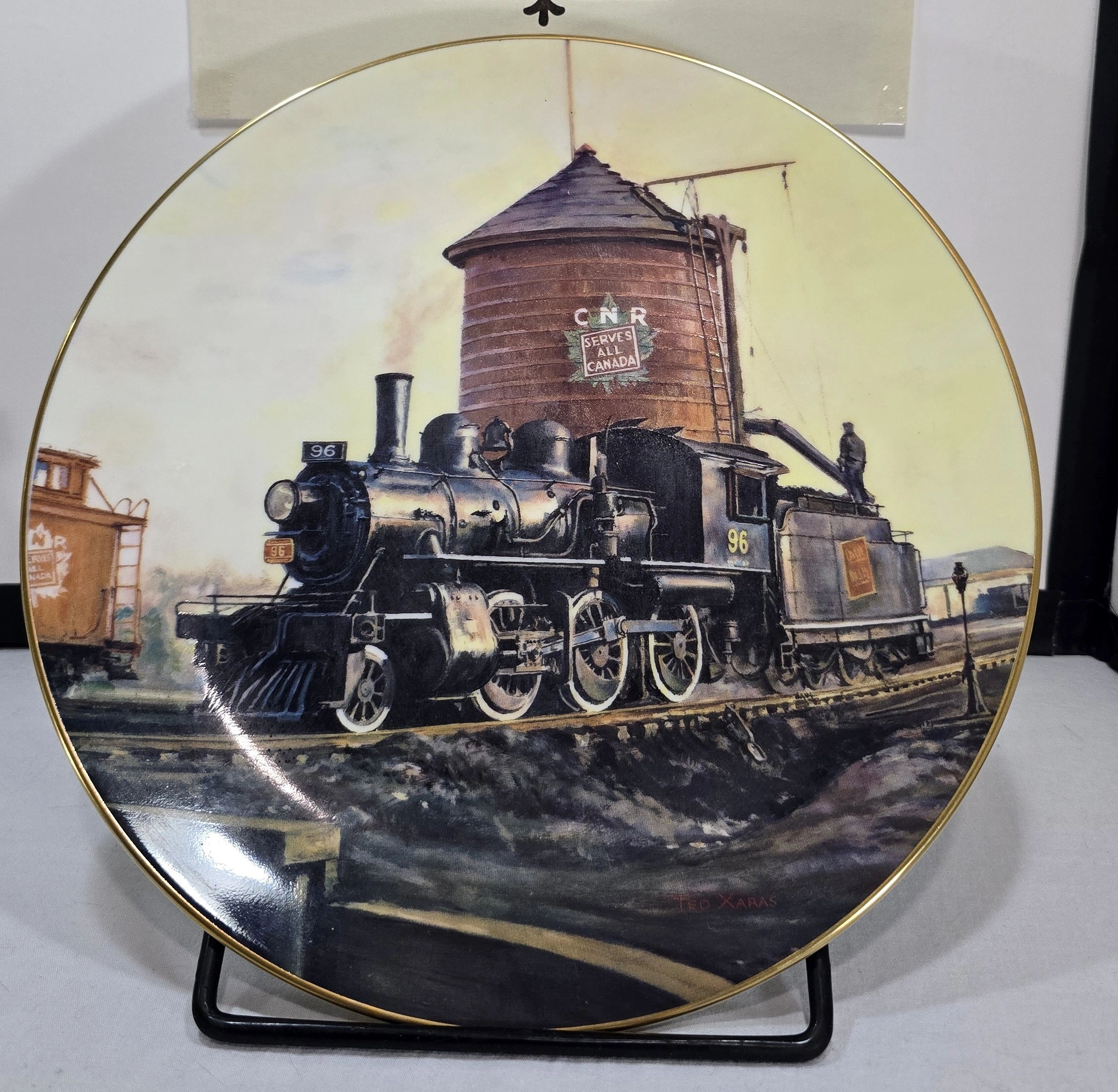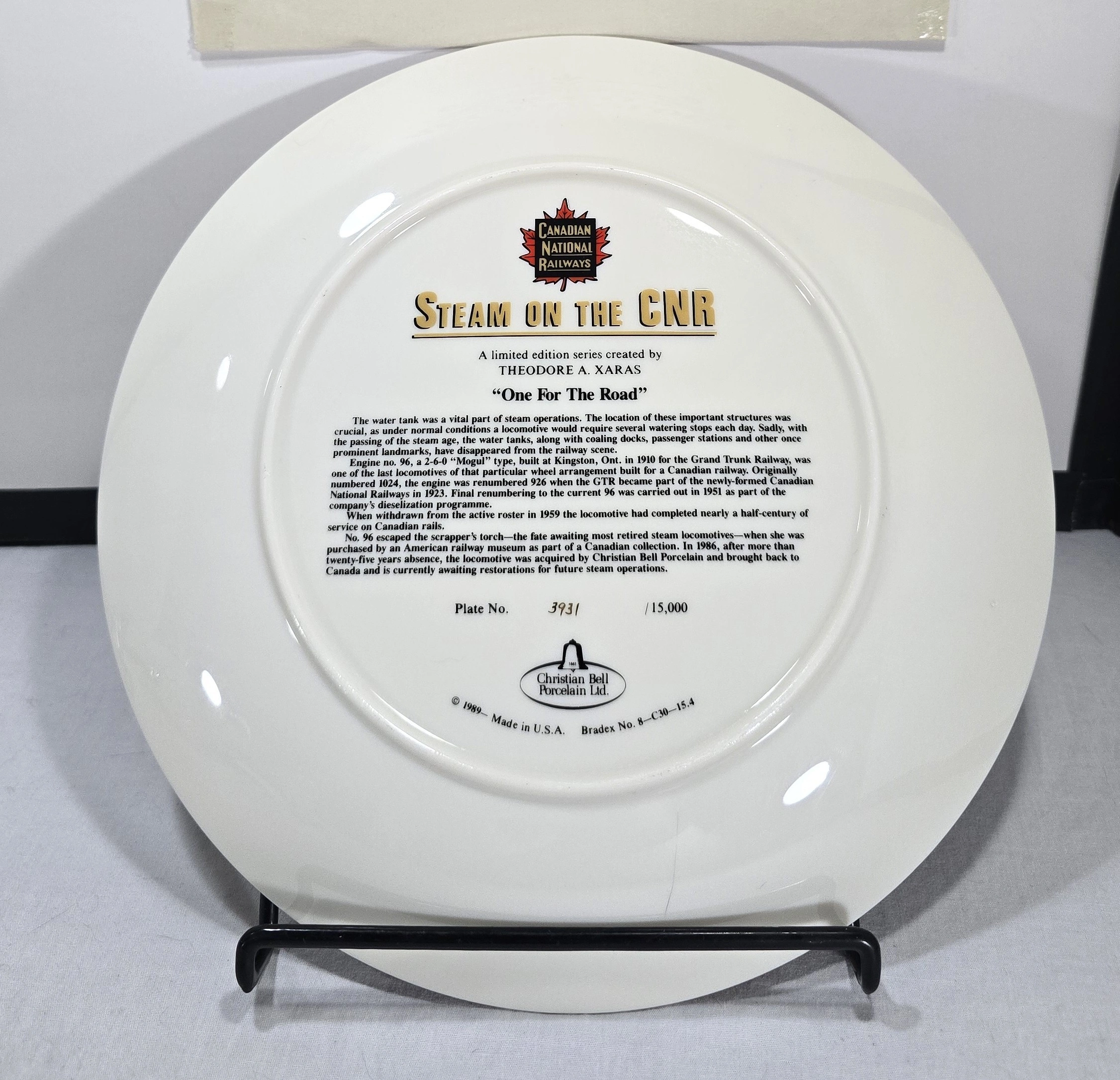 This collector plate was produced in 1989 as part of the 'Steam on the CPR' series celebrating the Canadian Pacific Railway's steam locomotive era. The series was created by artist Theodore A. Xaras and manufactured by Christian Bell Porcelain, commemorating iconic moments in Canadian railway history.