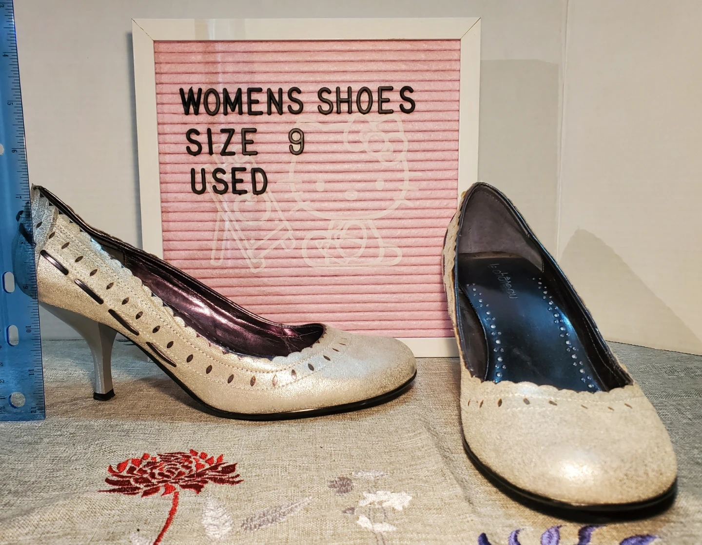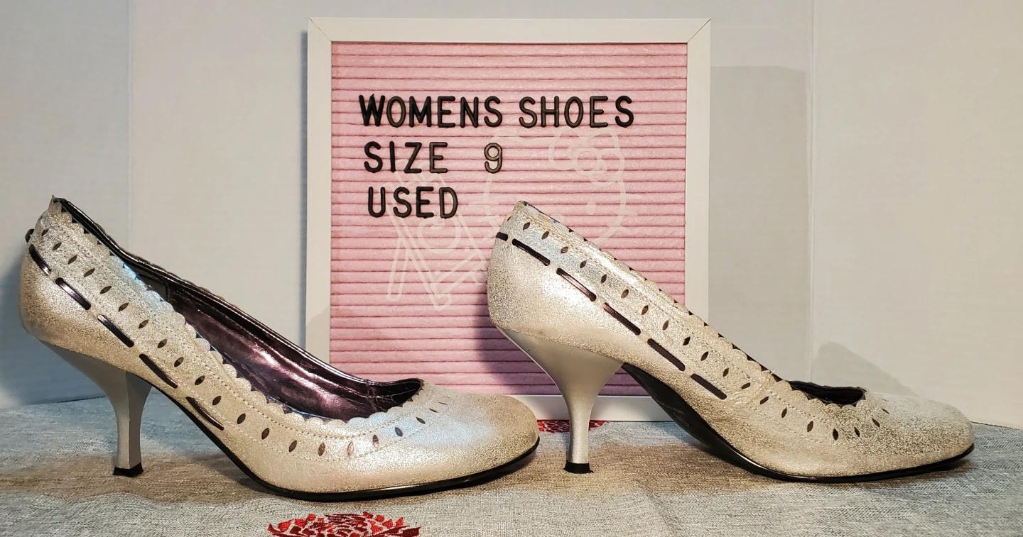 These Le Château, leather heels are a size 9 and feature a sparkly silver finish with decorative cut-out details. They have a rounded toe and a sculpted heel, perfect for dressing up an outfit. Heel height measures 3 inches. Excellent used condition.