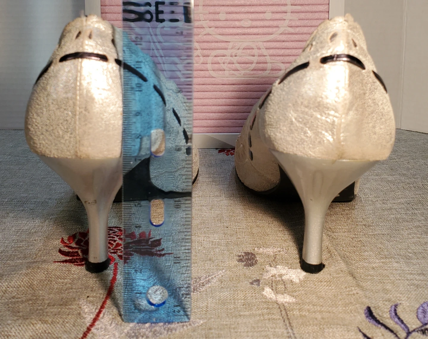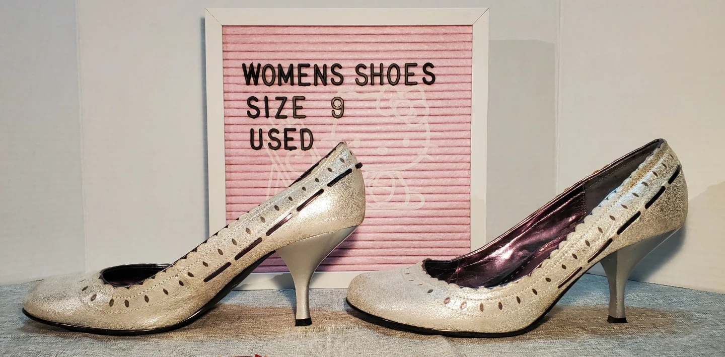 These Le Château, leather heels are a size 9 and feature a sparkly silver finish with decorative cut-out details. They have a rounded toe and a sculpted heel, perfect for dressing up an outfit. Heel height measures 3 inches. Excellent used condition.