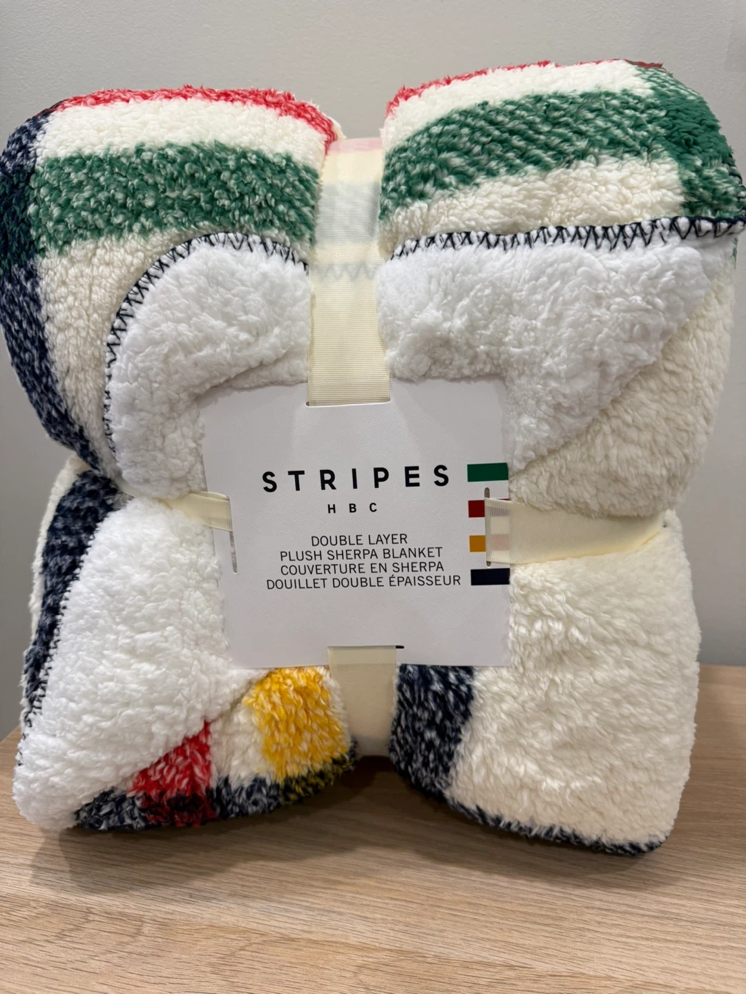 This is a double layer plush sherpa queen size blanket from Hudson's Bay. It features the iconic stripes in various colours. It's machine washable for easy care.